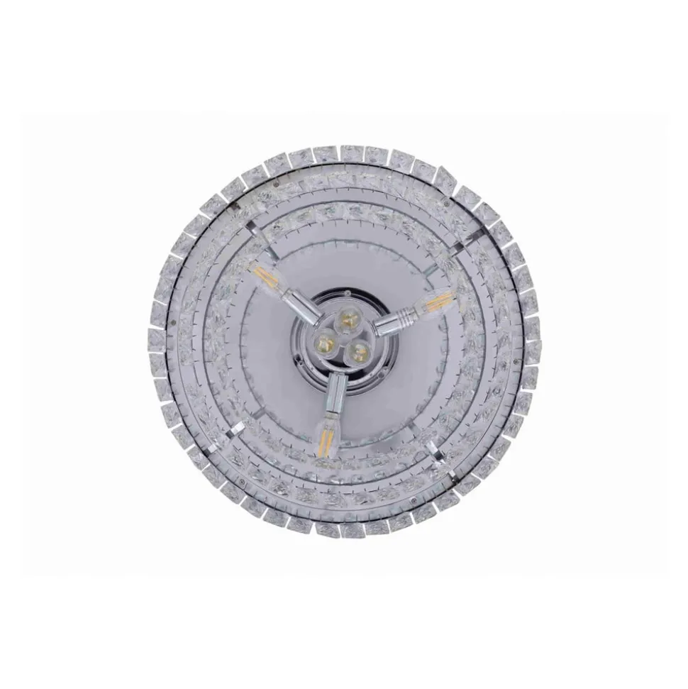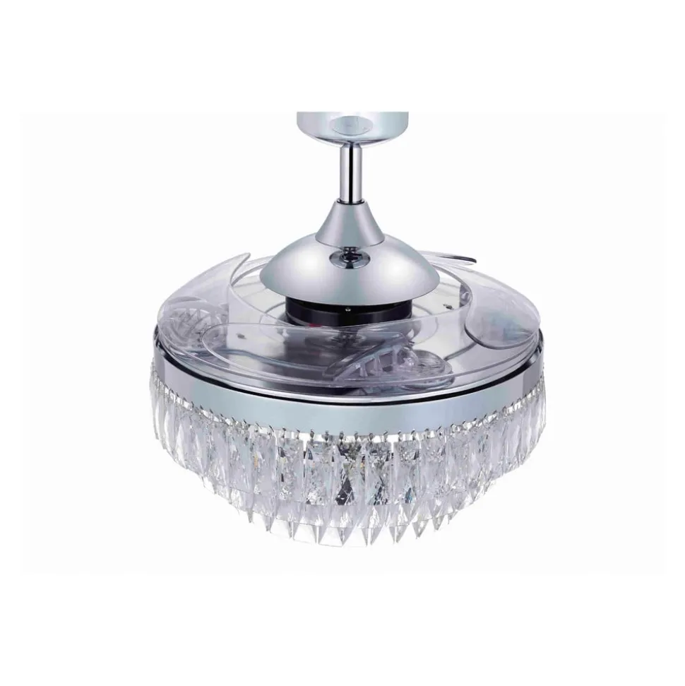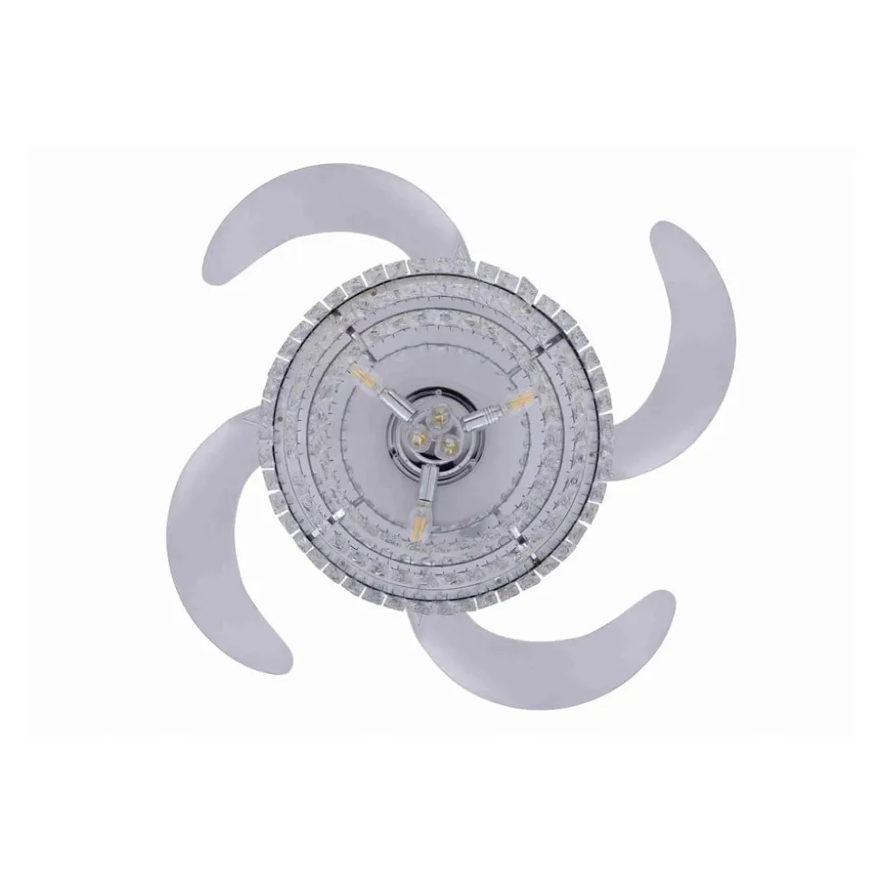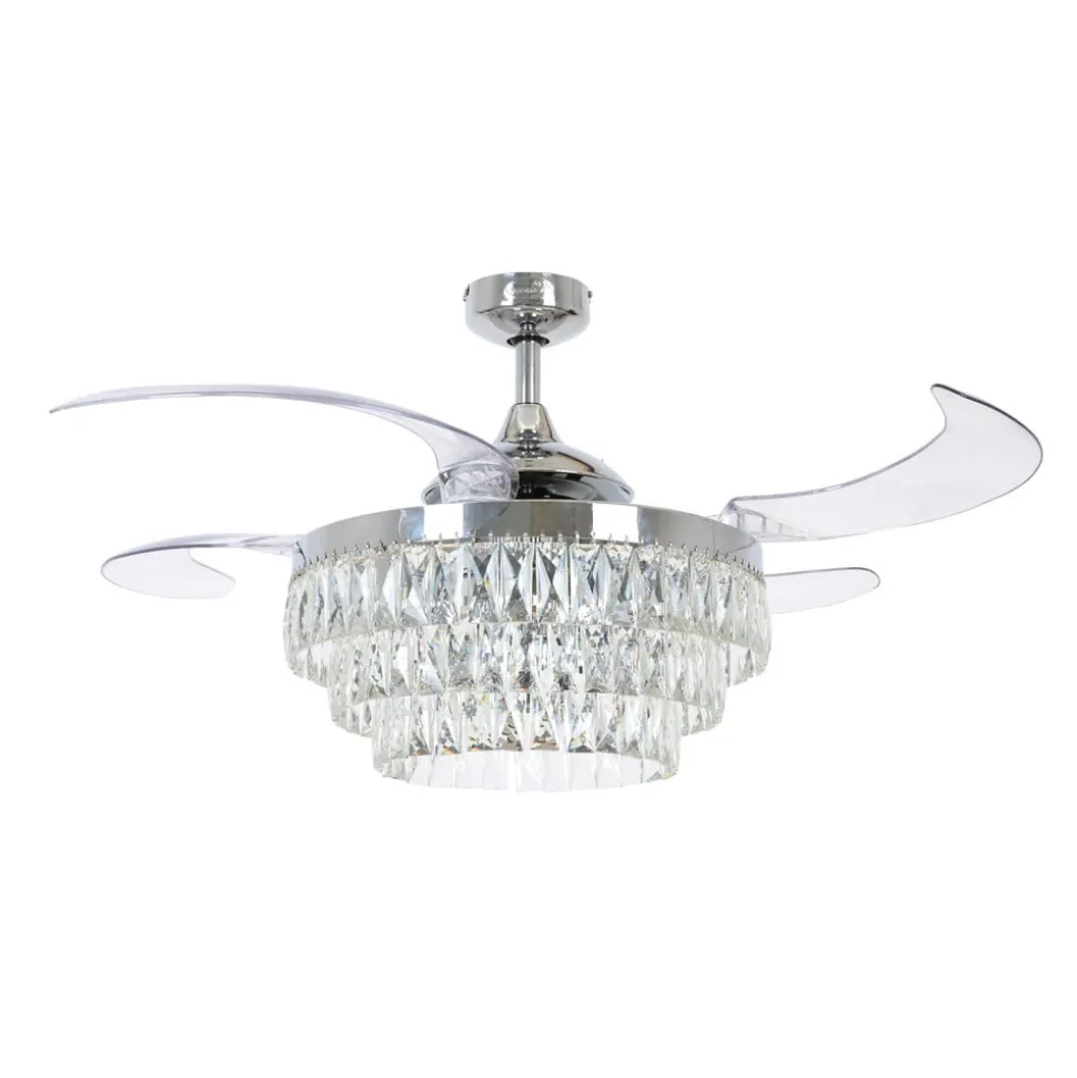 I krystallook – lysende loftventilator Fanaway Veil med fire udtrækkelige vinger og fjernbetjening Fanaway Veil er en elegant kombination af klassisk loftslampe og ventilator i krystal. De fire akrylblade er kun udfoldede i ventilatortilstand; når de udelukkende bruges som loftslampe, forsvinder de over huset. De fire medfølgende varmhvide E14 LED-lamper med glødetrådslook er placeret over et ophæng i krystallook, som giver en funklende lysoplevelse. Om sommeren giver Fanaway Veil en kølig brise. Om vinteren understøtter den reversible løberetning varmefunktionen. Også velegnet til nedhængte lofter. Funktioner: Fanaway Veil er udstyret med en vekselstrømsmotor, der muliggør tre hastighedsniveauer og en reversibel rotationsretning (justerbar på huset). Der medfølger passende lyskilder. Ventilator- og lysfunktionerne styres med den medfølgende fjernbetjening. Tekniske data: – Motorhastighed: 255/195/141 o/min – Motoreffekt: maks. 56 W – Luftcirkulation: maks. 180 m³/min Bemærk: Den medfølgende fjernbetjening kræver to AAA-batterier (medfølger ikke).