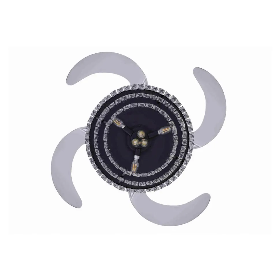 I krystallook – lysende loftventilator Fanaway Veil med fire udtrækkelige vinger og fjernbetjening Fanaway Veil er en elegant kombination af klassisk loftslampe og ventilator i krystal. De fire akrylblade er kun udfoldede i ventilatortilstand; når de udelukkende bruges som loftslampe, forsvinder de over huset. De fire medfølgende varmhvide E14 LED-lamper med glødetrådslook er placeret over et ophæng i krystallook, som giver en funklende lysoplevelse. Om sommeren giver Fanaway Veil en kølig brise. Om vinteren understøtter den reversible løberetning varmefunktionen. Også velegnet til nedhængte lofter. Funktioner: Fanaway Veil er udstyret med en vekselstrømsmotor, der muliggør tre hastighedsniveauer og en reversibel rotationsretning (justerbar på huset). Der medfølger passende lyskilder. Ventilator- og lysfunktionerne styres med den medfølgende fjernbetjening. Tekniske data: – Motorhastighed: 255/195/141 o/min – Motoreffekt: maks. 56 W – Luftcirkulation: maks. 180 m³/min Bemærk: Den medfølgende fjernbetjening kræver to AAA-batterier (medfølger ikke).