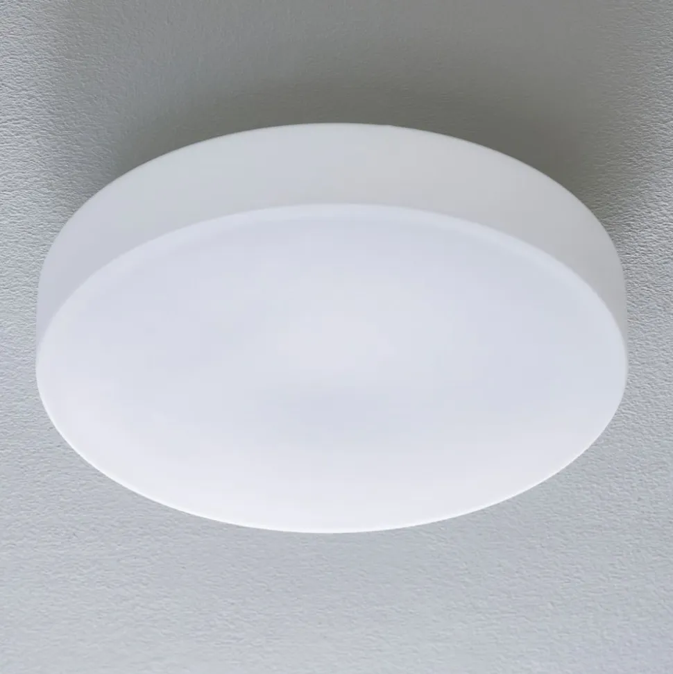 Denne væg- og loftslampe er takket være stænkvandsbeskyttelsen velegnet til brug i badeværelser, spa-områder eller indgange. Metalhuset er mindre end den matte, satinmatte skærm af mundblæst opalglas, så denne udgør hele den synlige del af armaturet. Det høje lysudbytte giver en effektiv grundbelysning, som samtidig er behagelig takket være den bløde lyseffekt. Det enkle, hvide design passer perfekt ind i mange moderne indretninger.