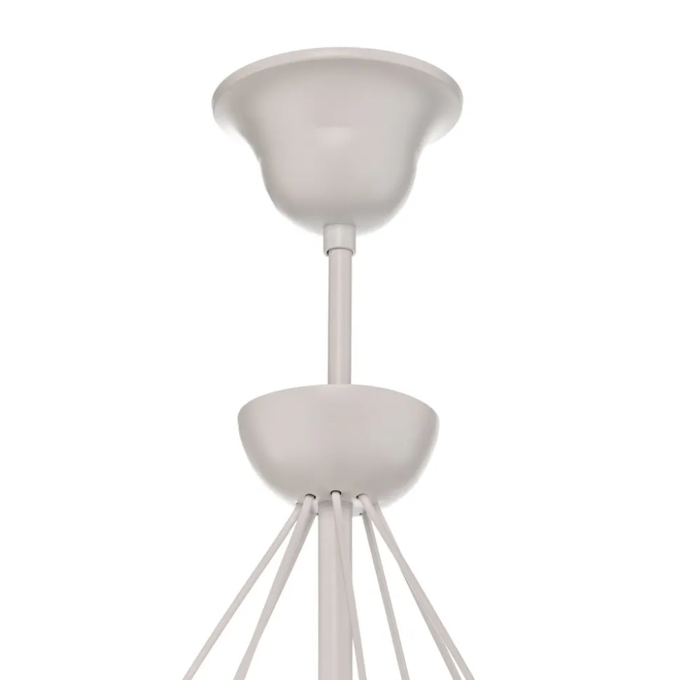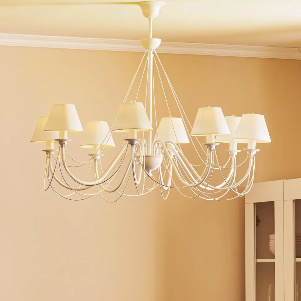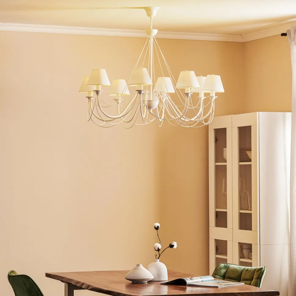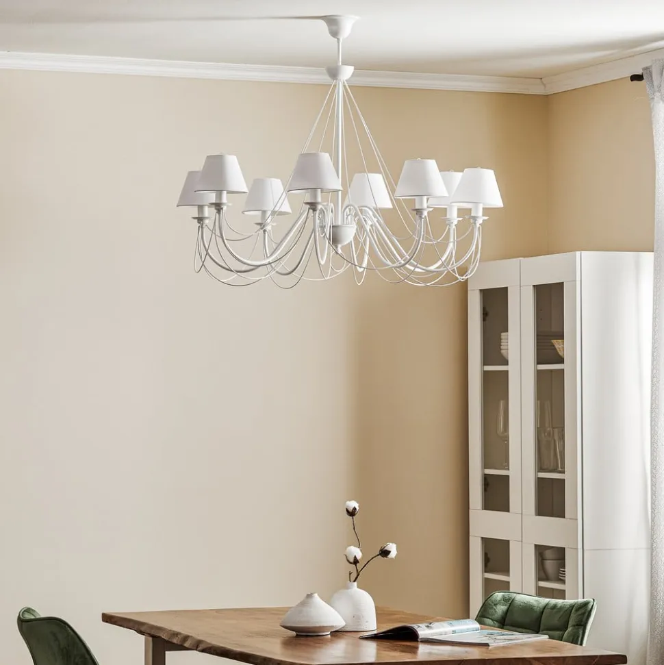 Lysekronen Bona er både tidløs og elegant på samme tid. Det hvide buede stel og tekstilskærmene, skaber tilsammen et harmonisk og moderne overordnet billede. Med dens pompøse art og en diameter på 100 cm, gør den hvide overflade den meget filigran. Med Bona opnår man et absolut højdepunkt i hjemmet.