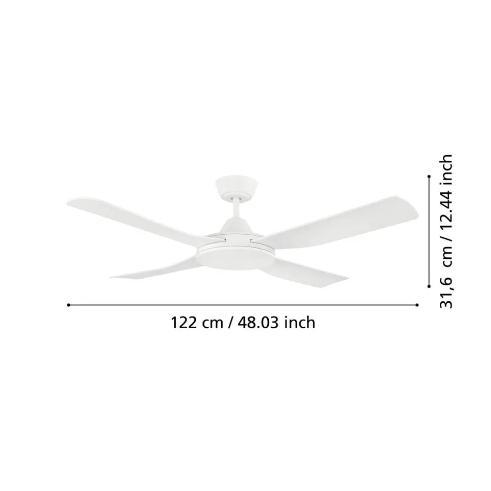 Bondi 1 loftventilator med fjernbetjening Bondi 1 loftventilatoren er lavet af ABS-plast af høj kvalitet (UV-bestandig) i mat hvid med fire blade. Den leveres med en fjernbetjening, der kan bruges til at skifte til tre forskellige hastighedsniveauer og vælge forskellige timere. Takket være den vendbare rotationsretning (sommer- og vinterdrift) kan ventilatoren bruges hele året rundt. Om sommeren til at skabe en kølig brise, om vinteren til at fordele den opvarmede rumluft jævnt – Velegnet til rum med en størrelse på 20-27 kvadratmeter – Kan monteres på lofter med en hældningsvinkel på op til 15° Tekniske data: – AC-motor, motoreffekt 52 W – Støjniveau 52 dB – Bladenes hældningsvinkel 9,5°