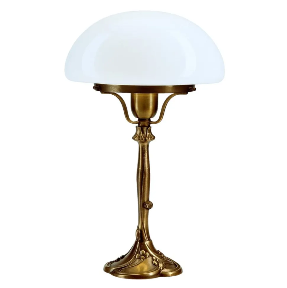 Klassisk bordlampe Katharina med halvkugleformet skærm Bordlampen KATHARINA har et klassisk design. Det er lånt fra en model fra begyndelsen af 1800-tallet og skaber dermed en næsten værdig atmosfære. Den næsten halvkugleformede glasskærm er mundblæst og monteret på basen af berlinermessing. Det er en overfladebehandling, der farver messingen med en umalet patina. Det giver en letplejet og ufølsom overflade, som kun skal rengøres med en blød klud.