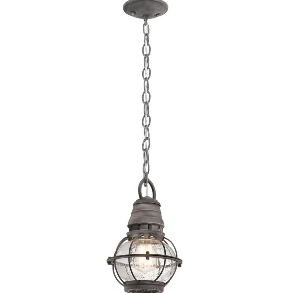 Designmodellerne til det smukke Bridge Point udendørs pendellampe med det pæreformede glas var de traditionelle forsendelses- og jernbanelys.