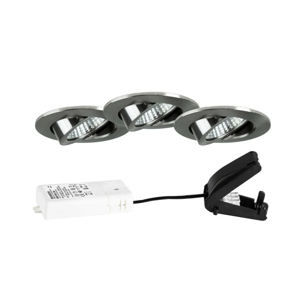 LED-indbygningsspot BB03 i sæt med 3 stk. med tilslutningsboks, med LED-driver, bagkantstyret dæmpbar (RC) Det runde LED-indbygningsspot BB03 af aluminium i et fordelagtigt sæt med 3 stk. med tilslutningsboks og LED-driver, der kan dæmpes via bagkantstyret dæmper, er det perfekte downlight til privat og offentligt interiør, fra hotellets festsale og korridorer til stuer. Spotsene er udstyret med varmhvide LED’er, der udsender et ensartet lys takket være sølvfarvede reflektorpærer med rotationssymmetrisk, smal bred lysfordeling og et gennemsigtigt polykarbonatdæksel. Spotsene kan drejes for at rette lyset mod det ønskede område. Installationen kan udføres uden værktøj ved hjælp af den medfølgende installationsfjeder – Inklusive LED-konverter; eksternt dæmpbar via bagkantfasestyring (RC) og tilslutningsboks – Udstrålingsvinkel: 38° – Drejningsområde: 30° hele vejen rundt – Lofttykkelse: maks. 1,3 cm
