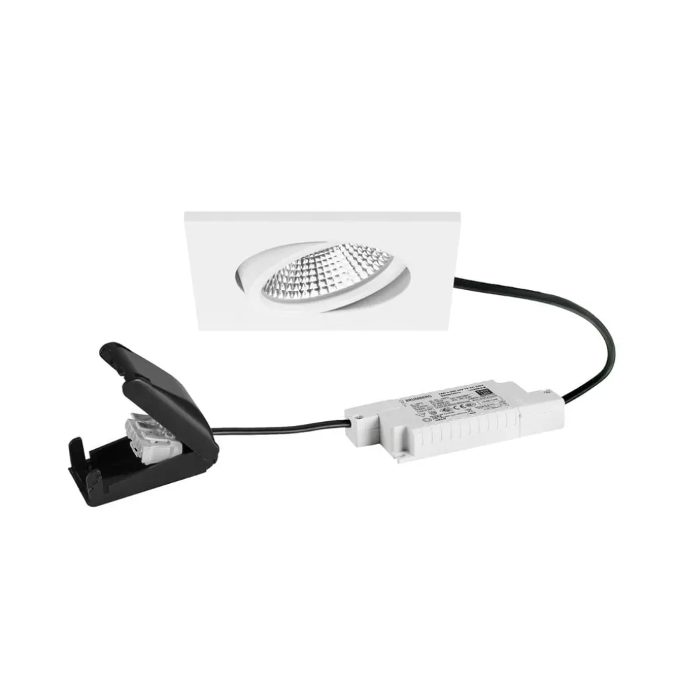 BB25 LED-indbygningsdownlight med dæmpbar LED-driver og tilslutningsboks Dette firkantede LED-indbygningsspotsæt består af et rundt, drejeligt spotlight i et firkantet hus, en LED-driver (RC), der kan dæmpes med en bagkantsfasedæmper, og en tilslutningsboks. Downlighten, som kan drejes 15° hele vejen rundt og har en høj IP5-beskyttelsesgrad, kan bruges til at belyse fugtige rum som badeværelser, wellnessområder, saunaer osv. Spotlightet er udstyret med en varmhvid LED i en sølvreflektor med rotationssymmetrisk, dyb lysfordeling bag en transparent plastafdækning og udsender lys med en strålevinkel på 36°. Udstyret med monteringsfjedre til værktøjsfri installation – maksimal lofttykkelse 1,7 cm – inklusive elektronisk forkobling, bagkant dæmpbar (RC) – med tilslutningsboks, 3-polet til gennemfortrådning – tilladt omgivelsestemperatur – 20 til 25 °C – må ikke dækkes med varmeisolerende materiale – høj IP65-beskyttelsesgrad – kan drejes 15°