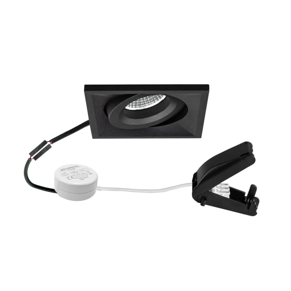 LED-indbygningsspot BB37 med rund LED-driver, dæmpbar og tilslutningsboks LED-indbygningsspot BB37, som kan drejes 20°, har en firkantet ramme og kan monteres i lofter med en tykkelse på op til 1,5 cm uden brug af værktøj ved hjælp af monteringsfjedre. Den leveres som et tilslutningsklart sæt til 230 V med en rund LED-driver, der kan dæmpes med en bagkantsfasedæmper (RC), og en tilslutningsboks. Det gode lysudbytte og den optimale lysfordeling garanteres af den sølvfarvede reflektor med rotationssymmetrisk, smalstrålende lysfordeling og den transparente polykarbonatafdækning – inkl. rund, elektronisk forkobling, bagkantfasedæmpbar – inkl. tilslutningsboks, 3-polet til gennemfortrådning – tilladt omgivelsestemperatur (ta): -20 °C – +25 °C – spot kan drejes 20° hele vejen rundt – maksimal loftstykkelse 1,5 cm