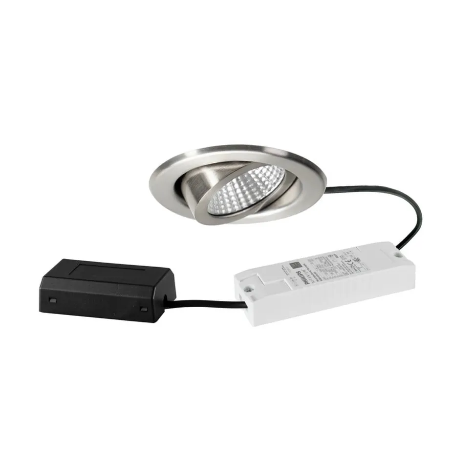 BB09 indbygget LED-downlight med DALI-dæmpbar LED-driver og tilslutningsboks Den runde indbyggede LED-downlight BB09 leveres som et komplet sæt klar til tilslutning med en DALI-dæmpbar LED-driver og en tilslutningsboks. Spotlightet kan drejes 25° for at rette lyset i den ønskede retning. Montering i op til 1,3 cm tykke lofter er værktøjsfri takket være monteringsfjedre – med sølvfarvet reflektor med rotationssymmetrisk, dyb og bredstrålende lysfordeling – afdækning af transparent polykarbonat for optimal lysfordeling – inklusive elektronisk styring, DALI-2-dæmpbar – inklusive tilslutningsboks, 5-polet til gennemfortrådning – ingen afdækning med varmeisolerende materiale
