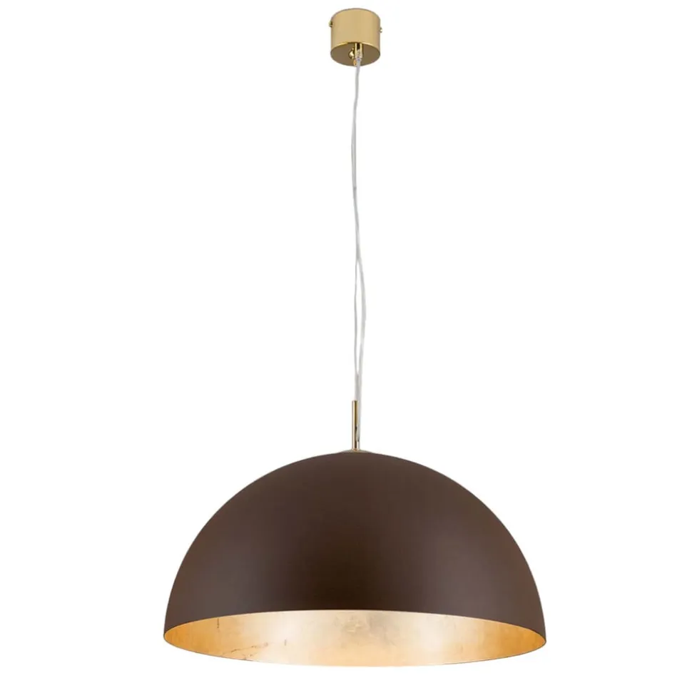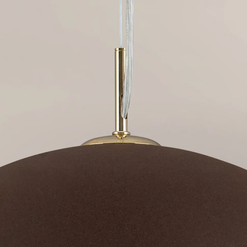 Den halvkugleformede lampeskærm på pendellampen Nerry er forsynet med en mat brun lakering yderst og belagt med bladguld på indersiden. Denne gyldne inderside tilfører lampen en yderligere glans i tændt tilstand og giver et særligt kraftigt lys. Det gyldne ophæng er belagt med 24 karat guld. Enkel i forhold til formen og på grund af sine særlige kendetegn dog alligevel ekstravagant – pendellampen Nerry overbeviser med mange egenskaber, ikke mindst fordi den er fremstillet i Italien og dermed kommer med et løfte om noget unikt og langlivet.
