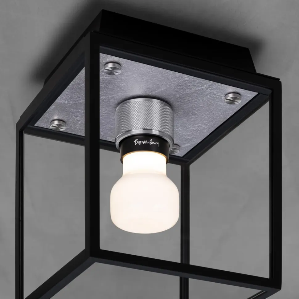 Caged Wet Lille designerloftslampe til badeværelser og udendørsarealer Denne loftslampe med bur består af et mat sort metal- og glasbur med en bagplade i støbt metal. Den har en solid metalfatning med tværgående rifling og karakteristiske møntskruer. Armaturet har en IP44-beskyttelsesgrad, hvilket betyder, at det er egnet til fugtige rum, badeværelser og udendørs brug. Metalbagpladerne har en unik patinering, overfladestruktur og støbemærker, der fortæller historien om, hvordan de blev lavet, og sikrer, at de er fulde af karakter. Dette armatur kan monteres på væggen eller i loftet.