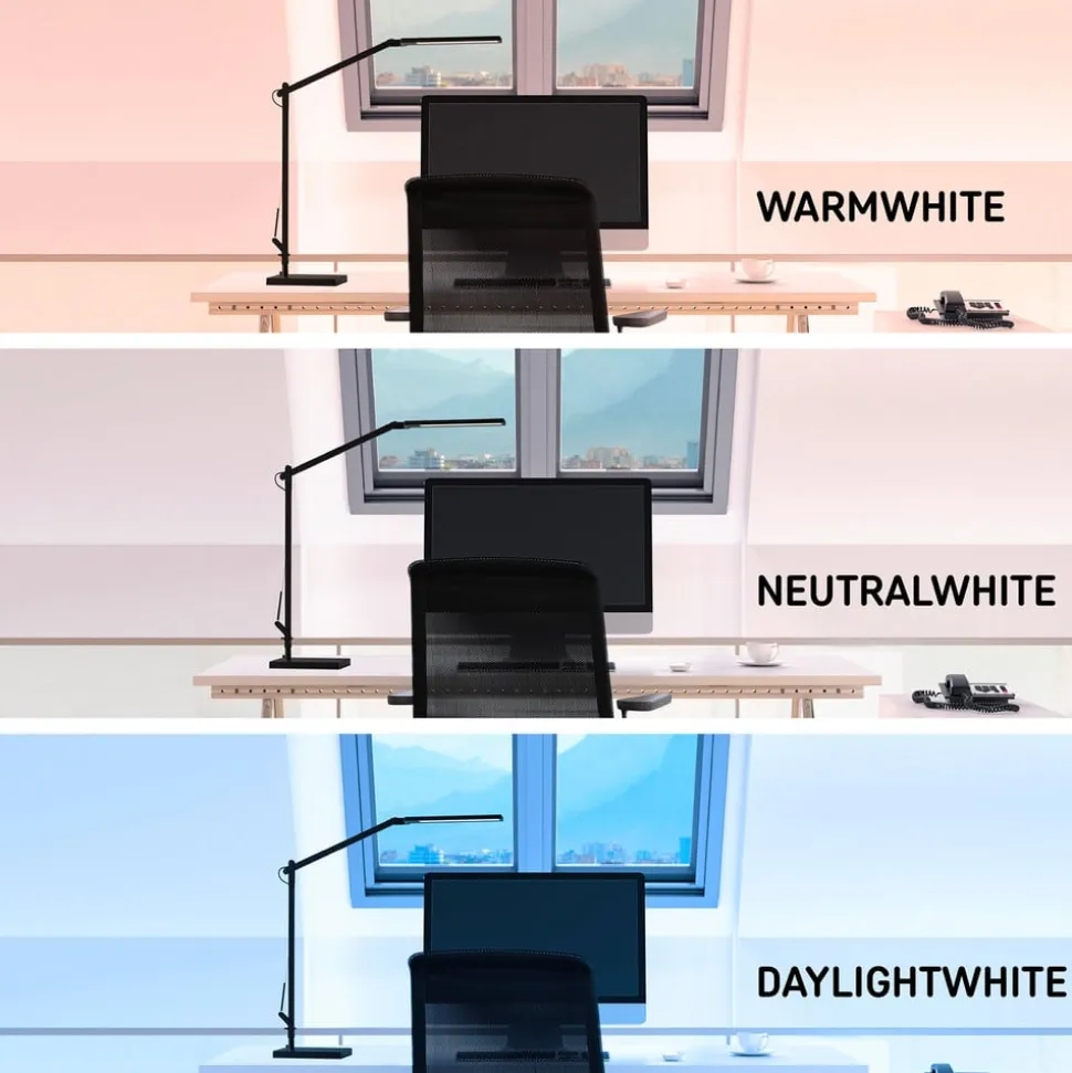 Cala LED-skrivebordslampe med skiftende lysfarve og lysdæmper Perfekt lys til hjemmekontoret: Den moderne Cala LED-skrivebordslampe giver ideel belysning til hjemmearbejdspladsen og maksimal lyskomfort. Et særligt highlight: Takket være Switch Tone-teknologien kan LED-lyset skifte farve i 3 trin ved hjælp af touch-kontrolpanelet. Mens hyggeligt varmhvidt lys indbyder til afslapning, er køligt hvidt dagslys ideelt til arbejde. Det betyder, at du kan indstille præcis den rigtige lystone til ethvert humør. Skrivebordslampen kan også dæmpes via kontrolpanelet, så du nemt kan justere lysstyrken, så den passer til dine behov. Så kan du altid skabe præcis den stemning, der passer til dig. LED-skrivebordslampen har ikke kun praktiske funktioner, men er også et smukt blikfang takket være det moderne, sorte look. Takket være stativet kan lampen placeres nemt og fleksibelt på ethvert skrivebord – Farvejusterbar LED-skrivebordslampe i 3 trin via touch-kontrolpanel: 3000 K / 4000 K / 6500 K – Kan dæmpes – Meget lavt energiforbrug