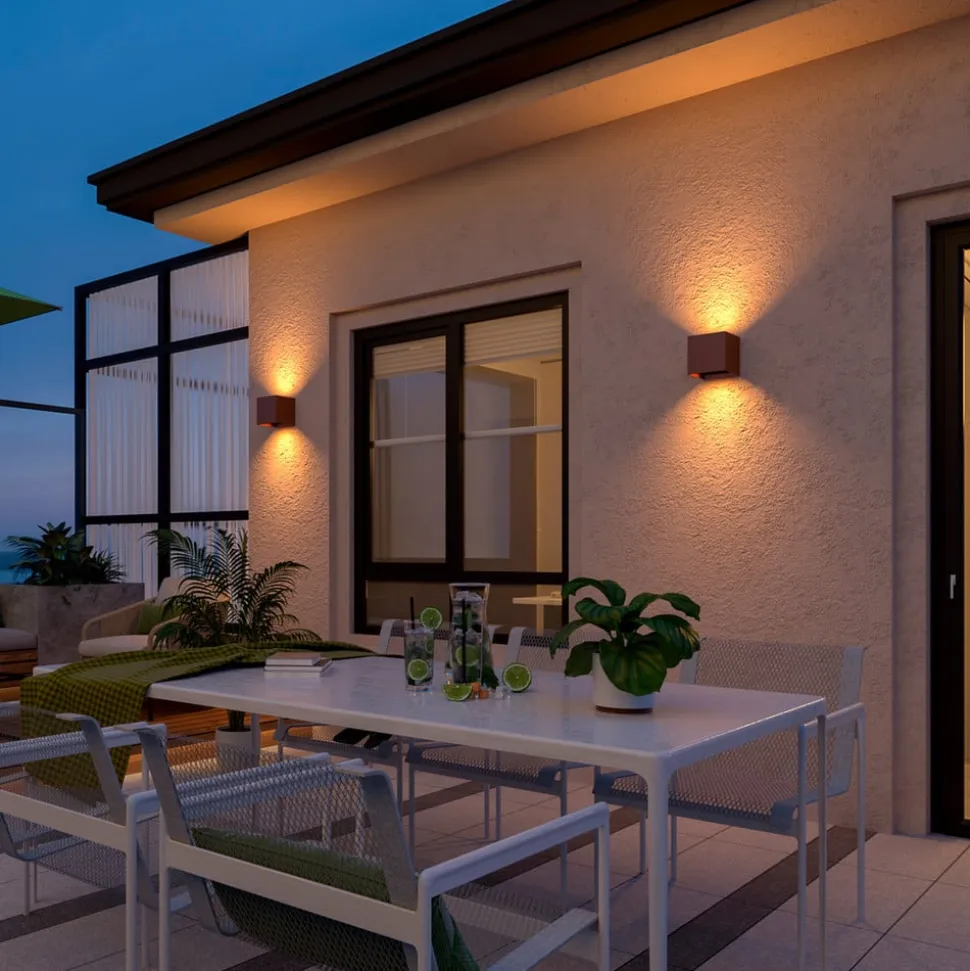 Udendørs væglampe Cube er beregnet til moderne accent- og orienteringsbelysning på facader og indgangsområder. Huset er fremstillet af aluminium og plast i en enkel kubisk form og har en ensfarvet finish. Bag plastdæksler er der integreret to varmhvide LED-lyskilder, hvis lys udsendes opad og nedad.