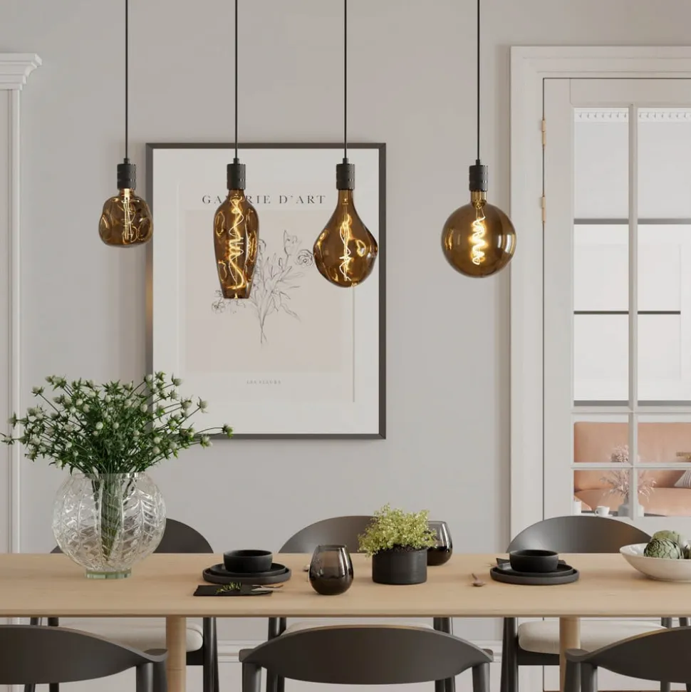 Individualitet i lampeform: E27 LED-lampe XXL Organic Neo Filament i G125-format, 1.800 Kelvin, dæmpbarLED-lampe XXL Organic Neo til E27-sokkel har sit navn fra sin naturlige, organiske form. Det individuelle design understøttes af den let tonede overflade, som også giver en særlig varm lyseffekt. Dens synlige glødetråde gør den også egnet til brug i armaturer med et åbent design eller uden skærm. Desuden er denne LED-lampe i G125-format dæmpbar.