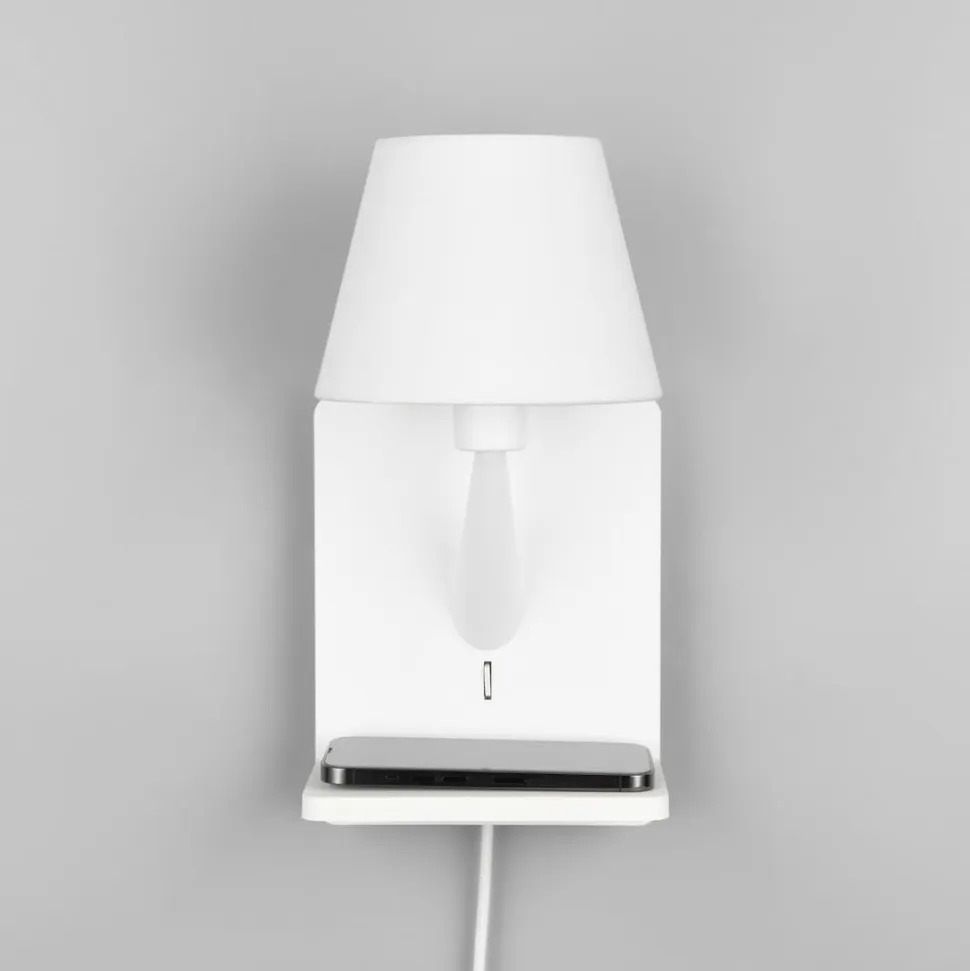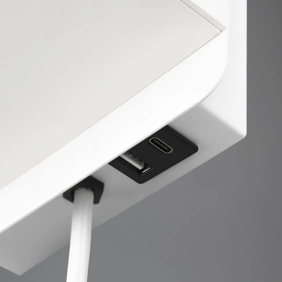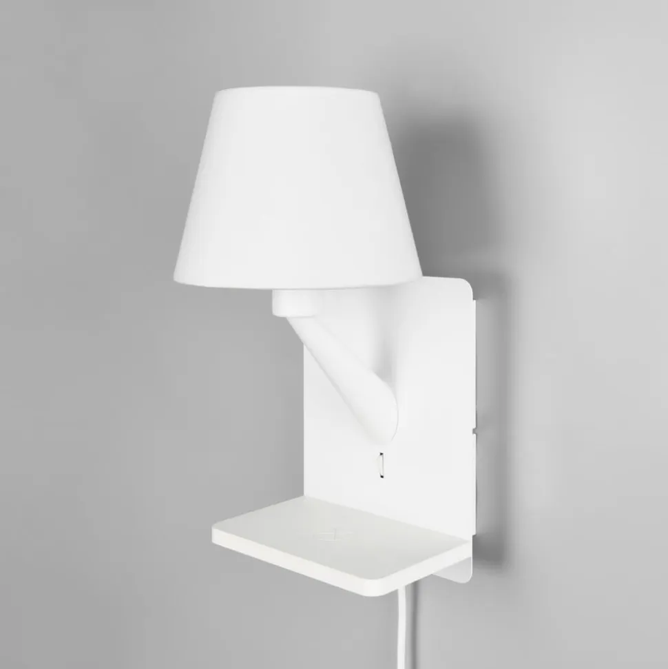 Comfort væglampe med skærm og mange funktioner Den ensfarvede Comfort væglampe af metal med tekstilskærm beviser sit navn med sine mange funktioner. Den er udstyret med en kontakt til direkte betjening, kan tilsluttes både til en stikkontakt og direkte til en vægtilslutning, har en induktiv ladestation på den praktiske hylde til mobiltelefoner og er udstyret med en USB- og en USB-C-tilslutning. Disse funktioner gør den til den ideelle lyskilde ved sengen.