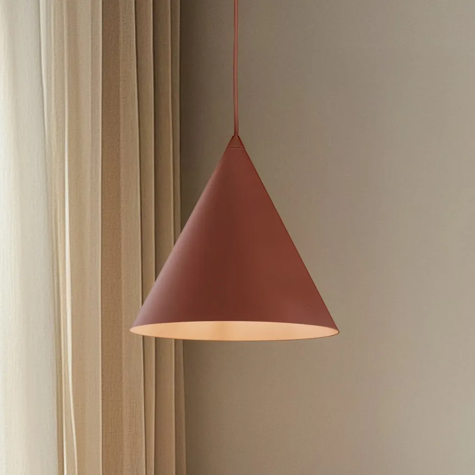 Konisk Cono-pendel i teglrød Skærmen på Cono-pendlen er lavet af stål i en tidløs konisk form og kommer i en mat teglrød farve. Lyset sendes nedad, hvilket gør pendlen ideel til bord- eller områdebelysning.