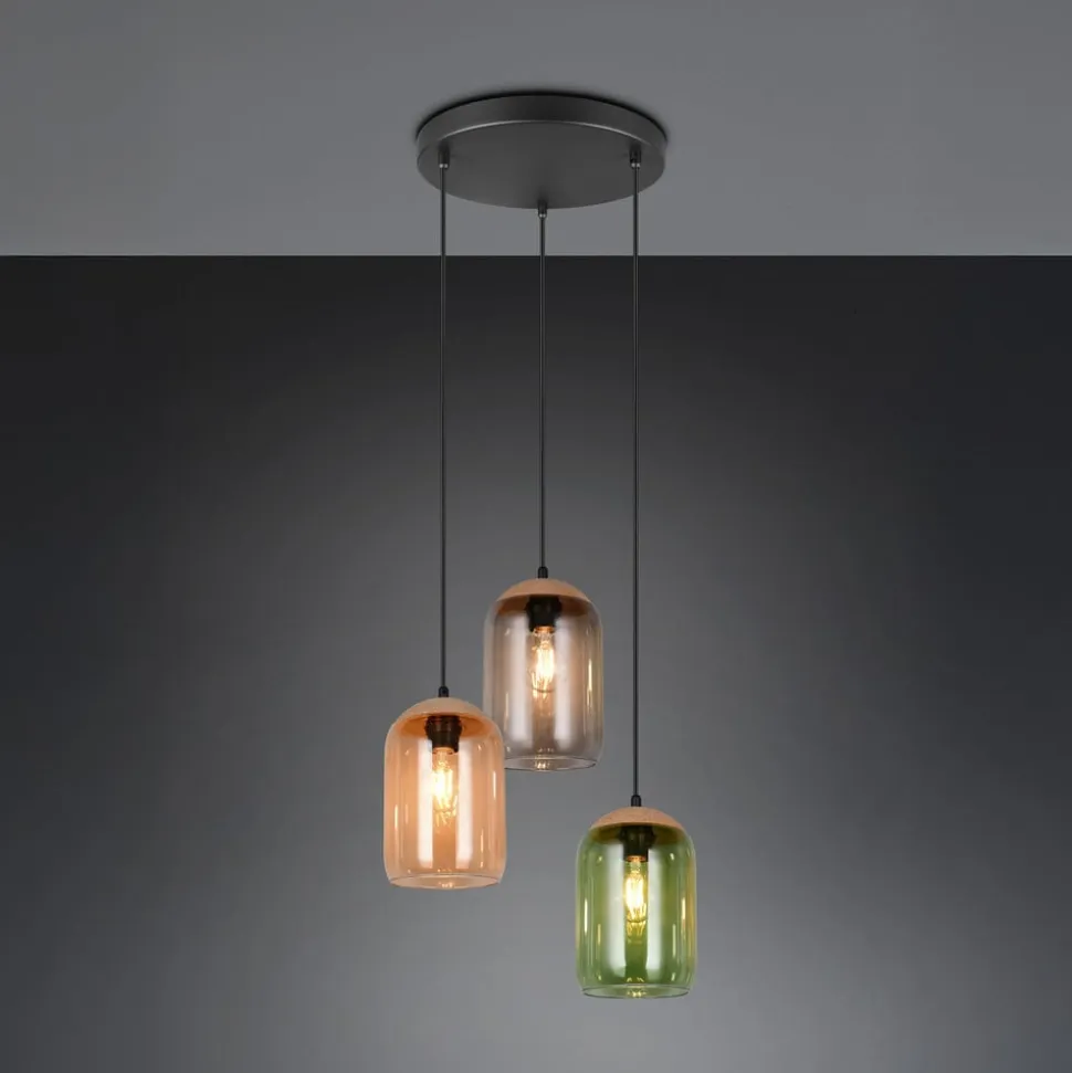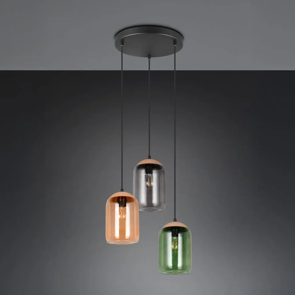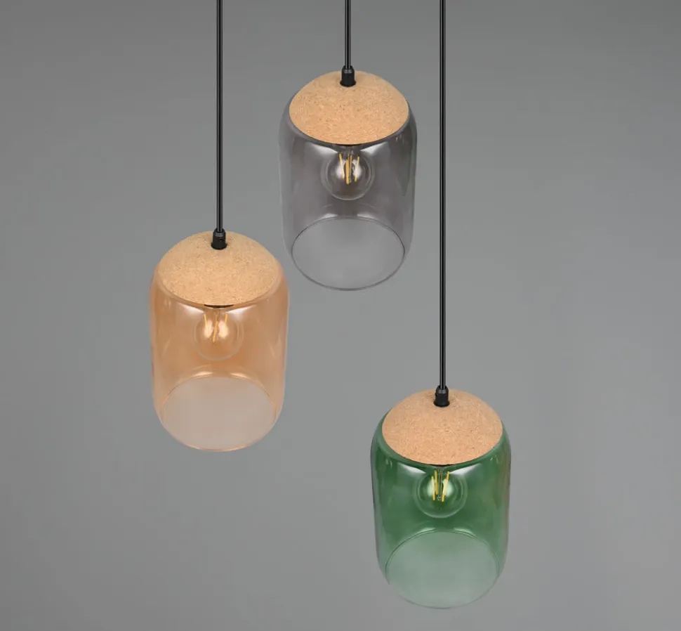 Cork-pendel med tre farvede glasskærme i en runding Cork-pendlen er udstyret med tre runde lampeskærme, hvis glas er tonet henholdsvis grønt, ravfarvet og røggråt. Der er også brune korkhætter på skærmene og en sort, rund baldakin i metal, hvorunder lampeskærmene er anbragt i en rundkreds.