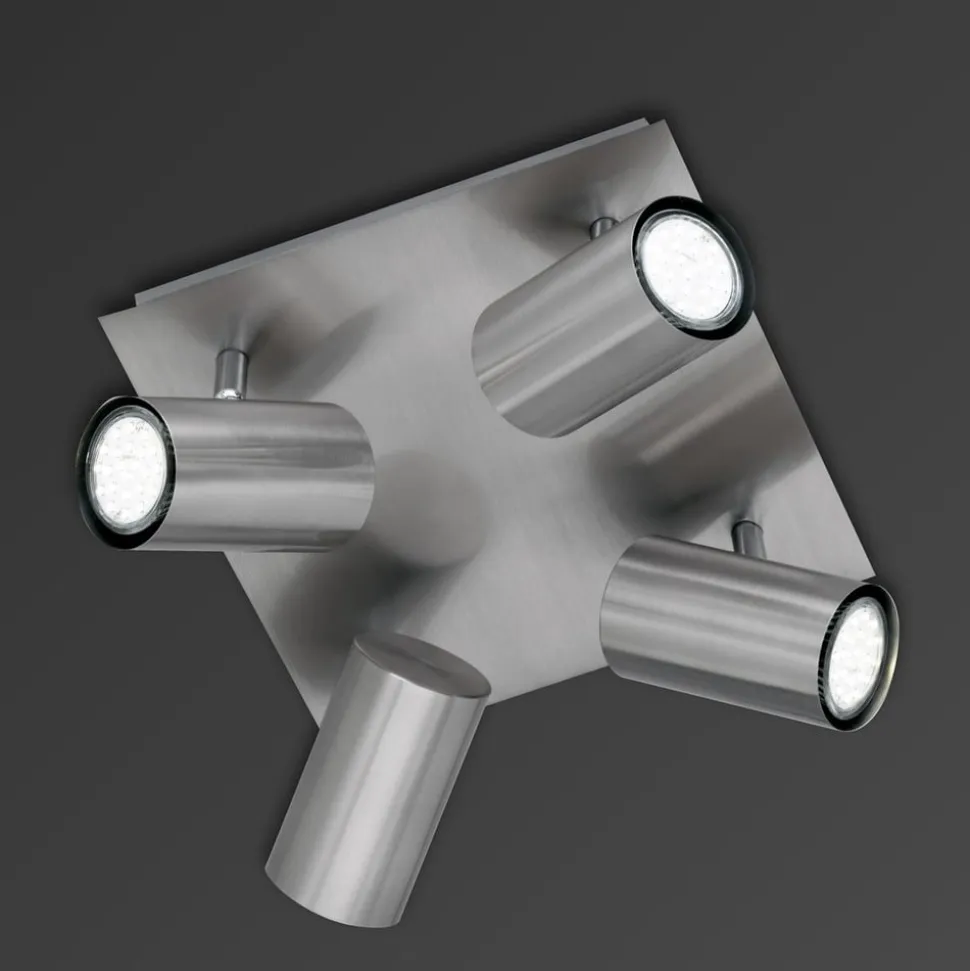 Passer til alle rum og er særdeles fordelagtigt til: Den matte nikkelfarvede loftslampe har en kvadratisk form, som har påmonteret fire halogenspots. Disse spots kan drejes i forskellige retninger, således at lyset nemt kan justeres som ønsket. Denne loftslampe optager lidt plads, hvilket gør den ideel til små rum.