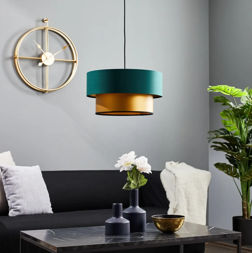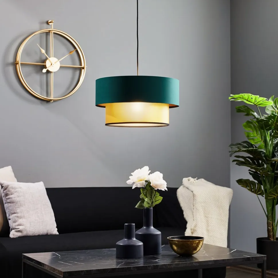 Hængelampen Dorina imponerer med sit unikke design med dobbelt skærm i en harmonisk kombination af grøn og guld. Denne lampe sætter stilfulde accenter og giver ethvert rum en særlig atmosfære. Den dobbelte skærm sikrer en jævn lysfordeling og skaber en behagelig atmosfære, der er velegnet til både afslappede aftener og produktive timer.