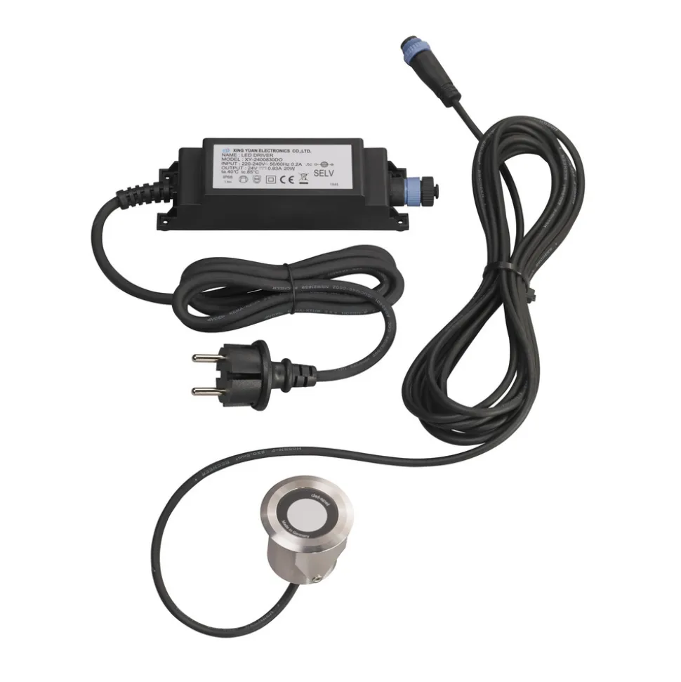 LED indbygningsspot sæt mini i rustfrit stål til udendørs brug – diffus lysudsendelse, kan udvides Sættet indeholder alle de nødvendige komponenter til at skabe attraktiv orienterings- eller accentbelysning i grønne områder, forhaver, terrasser, gangstier eller indkørsler. Den runde indbygningsspot består af et V4A-hus i rustfrit stål og en afdækning af hærdet, opalt sikkerhedsglas, som sikrer en diffus og bred udstråling (120°) af varmhvidt lys – Armatur med 5 m tilslutningskabel og 24 V-stik – Inkluderer 230 V til 24 V strømforsyningsenhed (maks. 20 W) med 1,5 m kabel og 230 V eksternt stik – Kan udvides med ekstra armaturer (se tilbehør) – Beskyttelsesklasse: IP68 – Slagfasthed: IK08 – God farvegengivelse: CRI > 90 – Kan bruges permanent under vand op til en maksimal dybde på 1 m – Omgivelsestemperatur under drift: – 25 °C til + 50 °C – Belastningskapacitet: maks. 3 t Bemærk: Den samlede effekt fra alle forbrugere, der er tilsluttet strømforsyningen, bør være ca. 10 % mindre end strømforsyningens nominelle effekt.