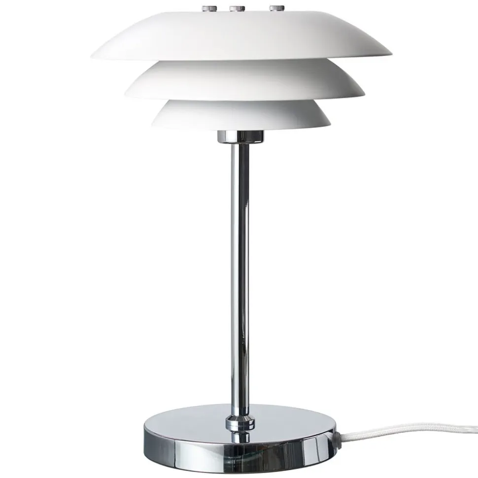 DL-bordlampe med metalskærm bestående af tre elementer Et forkromet lampestel og en skærm bestående af tre matlakerede metalelementer i en buet form – det er DL-bordlampen fra det danske lampemærke Dyberg Larsen. Bordlampen i et klart skandinavisk design er et ikon blandt bordlamper og imponerer med sin smukke lysfordeling. Takket være skærmens design giver den integrerede lyskilde ikke kun direkte lys på overfladen nedenunder, men også et blødt, behageligt lys i rummet, der skinner gennem mellemrummet mellem de enkelte skærmelementer. DL-bordlampen er et blikfang i stuen på et bord, en skænk eller i vindueskarmen, eller i soveværelset som sengelampe. Den er udstyret med et 160 cm langt kabel med en integreret afbryder.