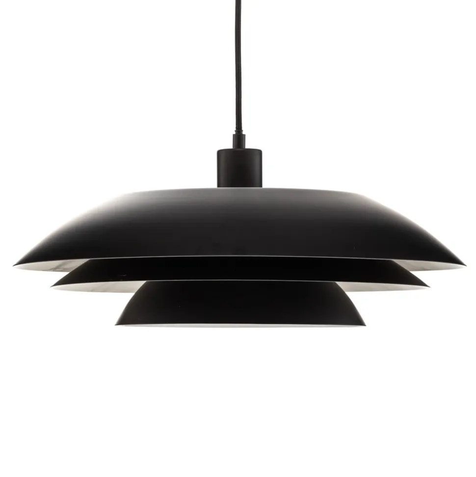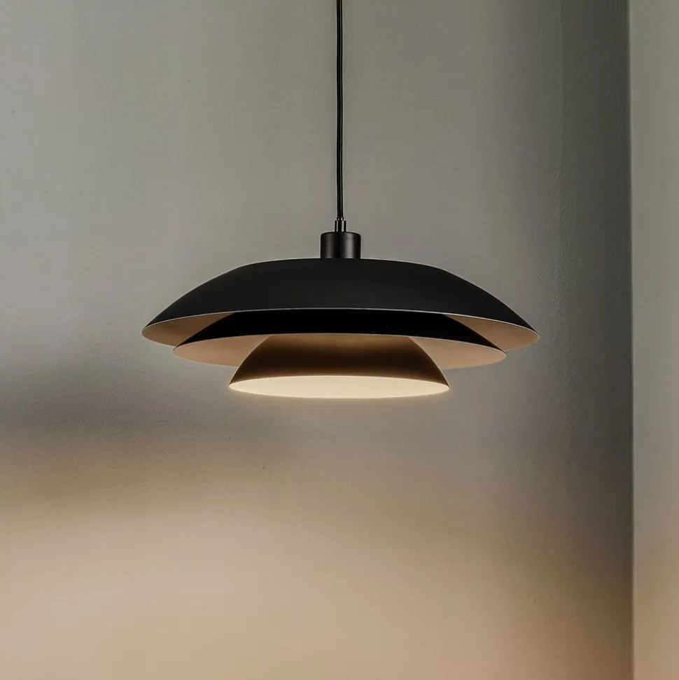 Skærmen på DL-pendellampen er lavet af lakeret metal med en mat finish. Tre elementer i forskellige størrelser, der er formet som plader, er anbragt inden i hinanden for at danne en skygge, hvorfra lyset ikke kun slipper ud gennem åbningen i bunden, men også gennem rummene rundt om. På denne måde oplyser DL pendellampen perfekt en bordflade direkte og samtidig rummet generelt. Det smukke udseende med et skandinavisk design gør armaturet til en passende lysdispenser over spisebordet eller køkkenbordet i mange indretningsstile, som vil være en kilde til glæde i lang tid.
