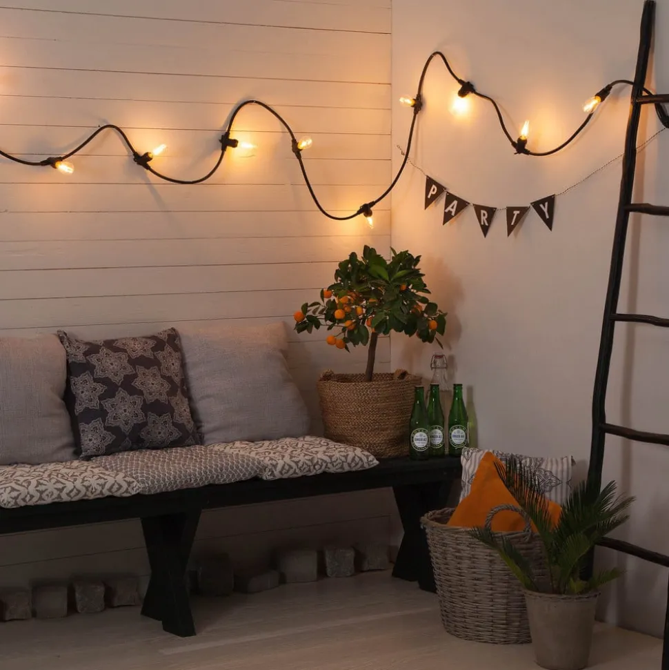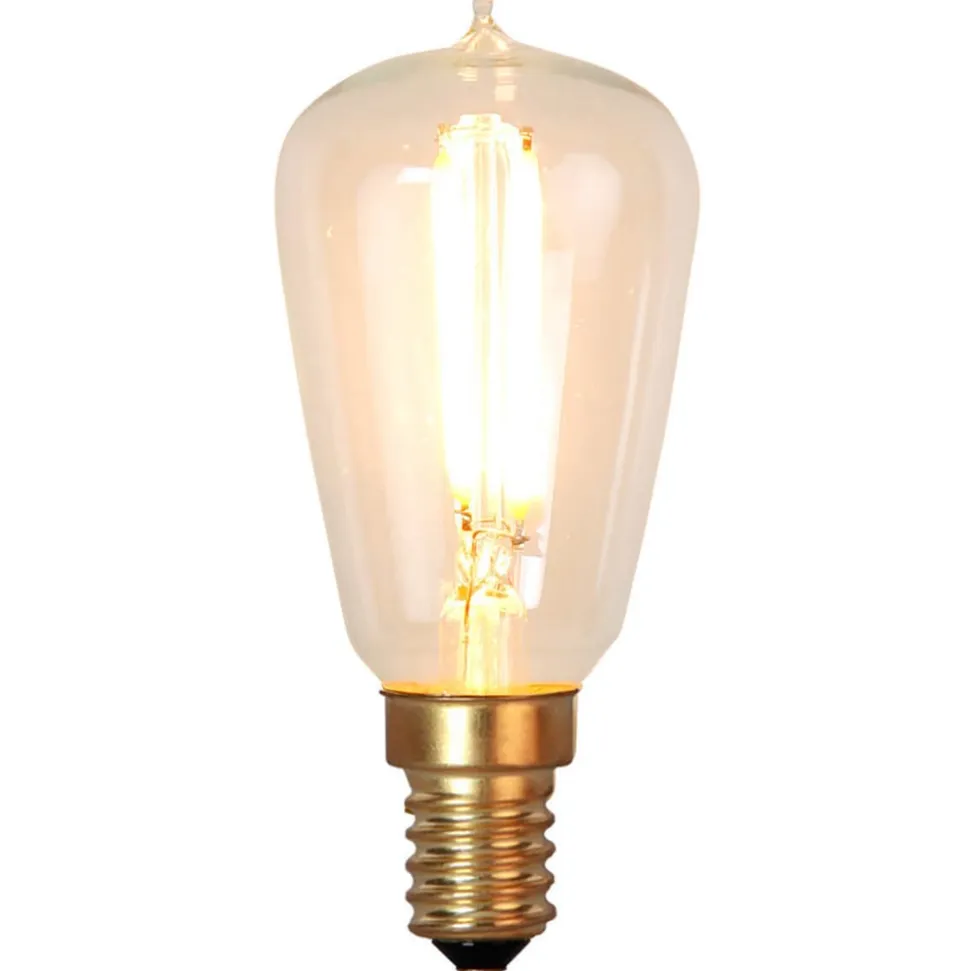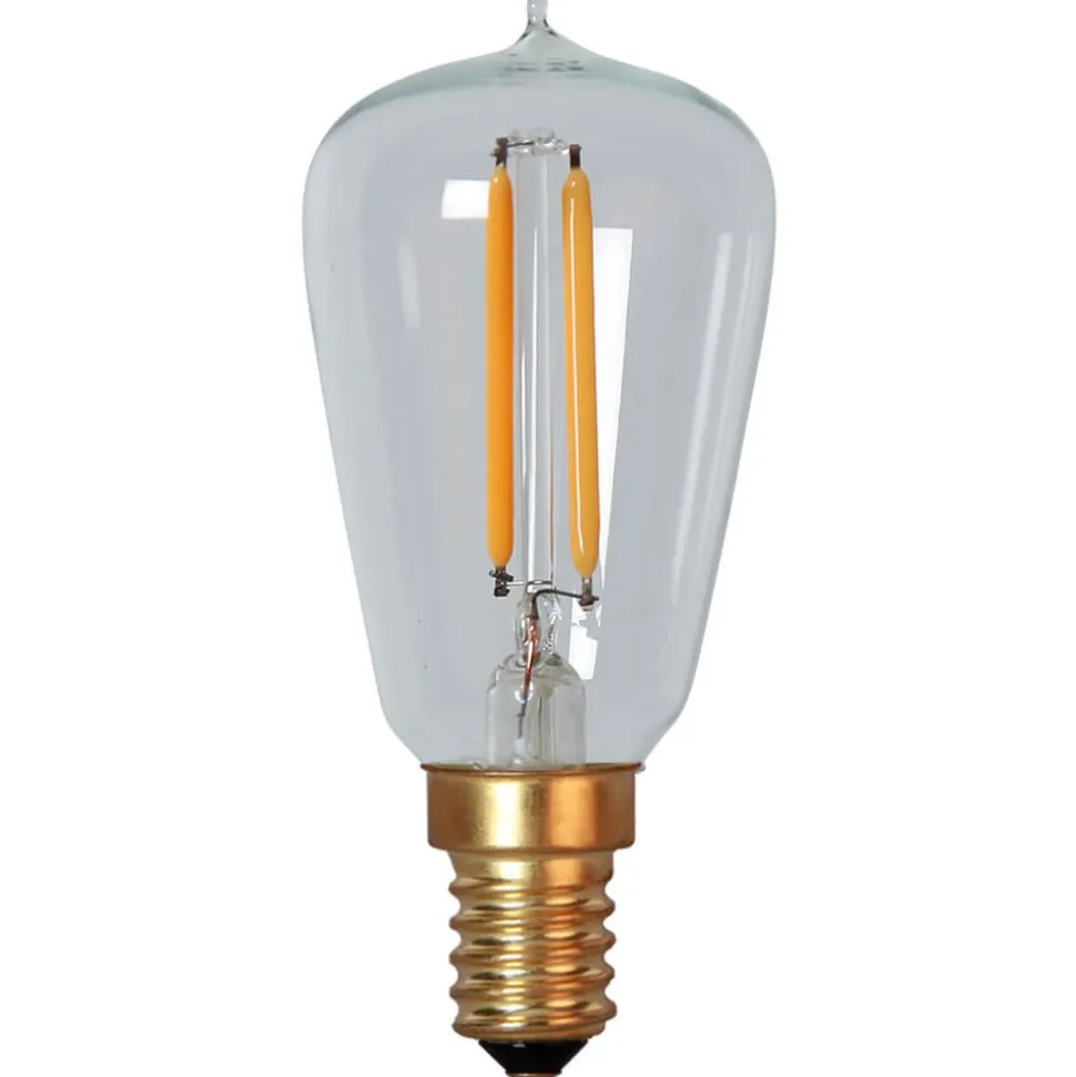 E14 1,8W LED-pære med filamentpære Denne LED-pære er et HighLight i en kompakt form. Glasset har dråbeform og bliver bredere mod toppen. Det giver et klart udsyn til glødetrådene, som ligner glødetråden i en almindelig glødepære. Det varmhvide lys sætter bløde lysaccenter og sikrer en god fornemmelse i hjemmet. Den indbyggede LED-teknologi ser godt ud og er lige så økonomisk. Lampen har fået tildelt den højeste energiklasse A++. Egenskaber: – meget velegnet til dekorativ belysning – højeste energiklasse A++ – varmhvidt lys 2200 K – naturtro farvegengivelse – dæmpbar