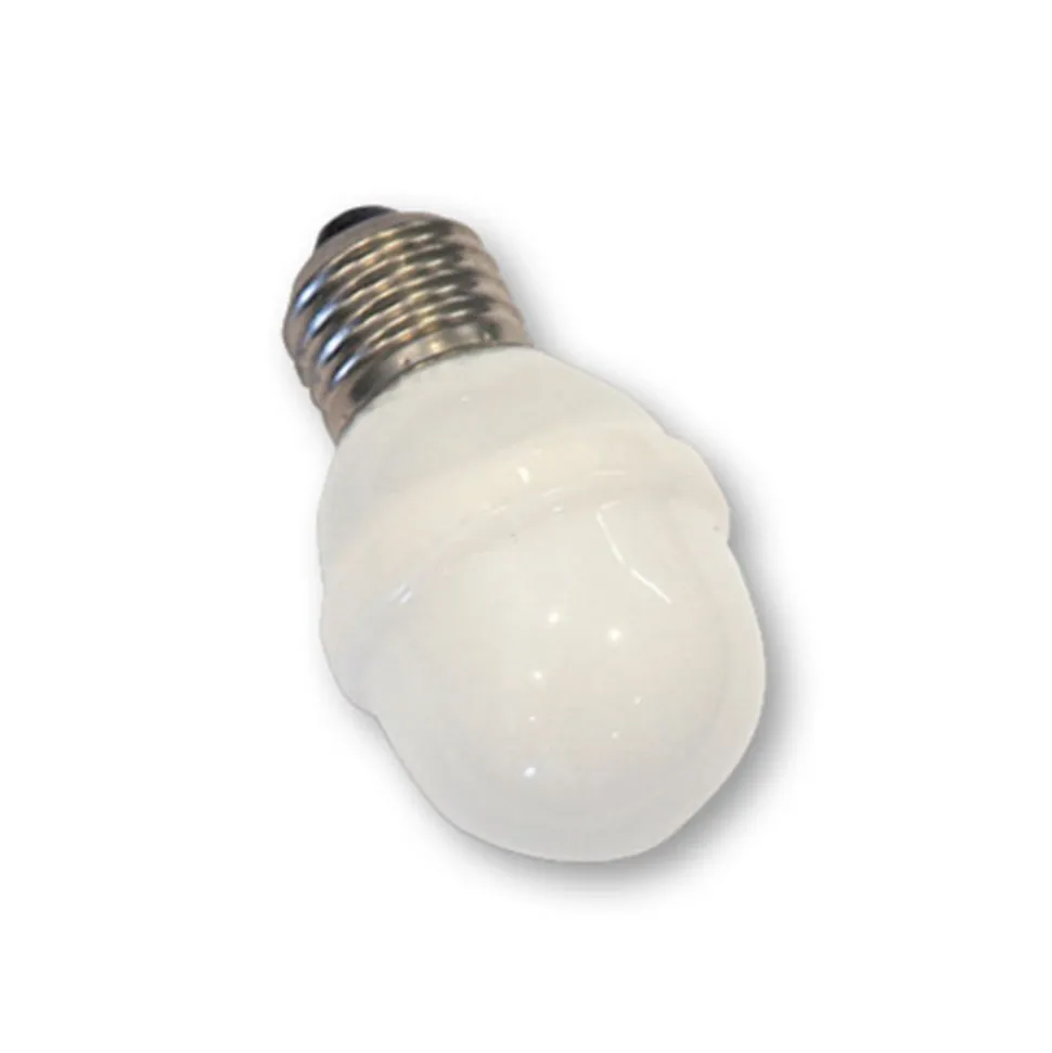 E27 LED-lampe i form af en golfbold Denne lille LED-dekorationslampe med E27-sokkel er velegnet som erstatningslampe for lyskæder eller til brug i dekorationslamper. Den lille lampe er lavet af brudsikker, hvid plast. Afhængigt af versionen belyses lampens materiale af de farvede eller hvide LED’er.
