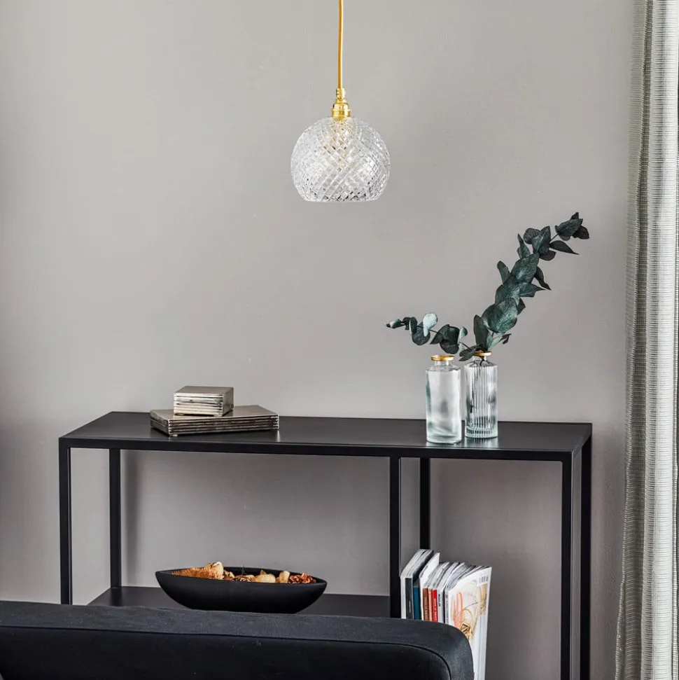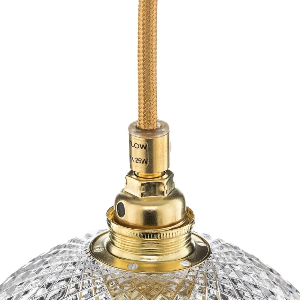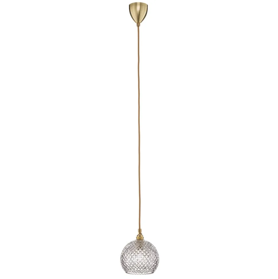 Det håndblæste glashus af krystalglas er specielt i designet af Rowan-hængelampen. Dette gør det muligt for lyset at oplyse rummet lyst på alle sider. fatning og tekstilkablet af høj kvalitet, der er forsynet med en skinnende guldfarve og afrunder designet på en ædle måde, danner en flot kontrast. Med sit klassiske udseende og enkle design er Rowan pendlen ideel til at supplere mange forskellige leveformer. Uanset om det installeres individuelt eller i grupper, hvad enten det er i hjørner eller over bordet, tilbyder Rowan-lampen altid et dekorativt blikfang.