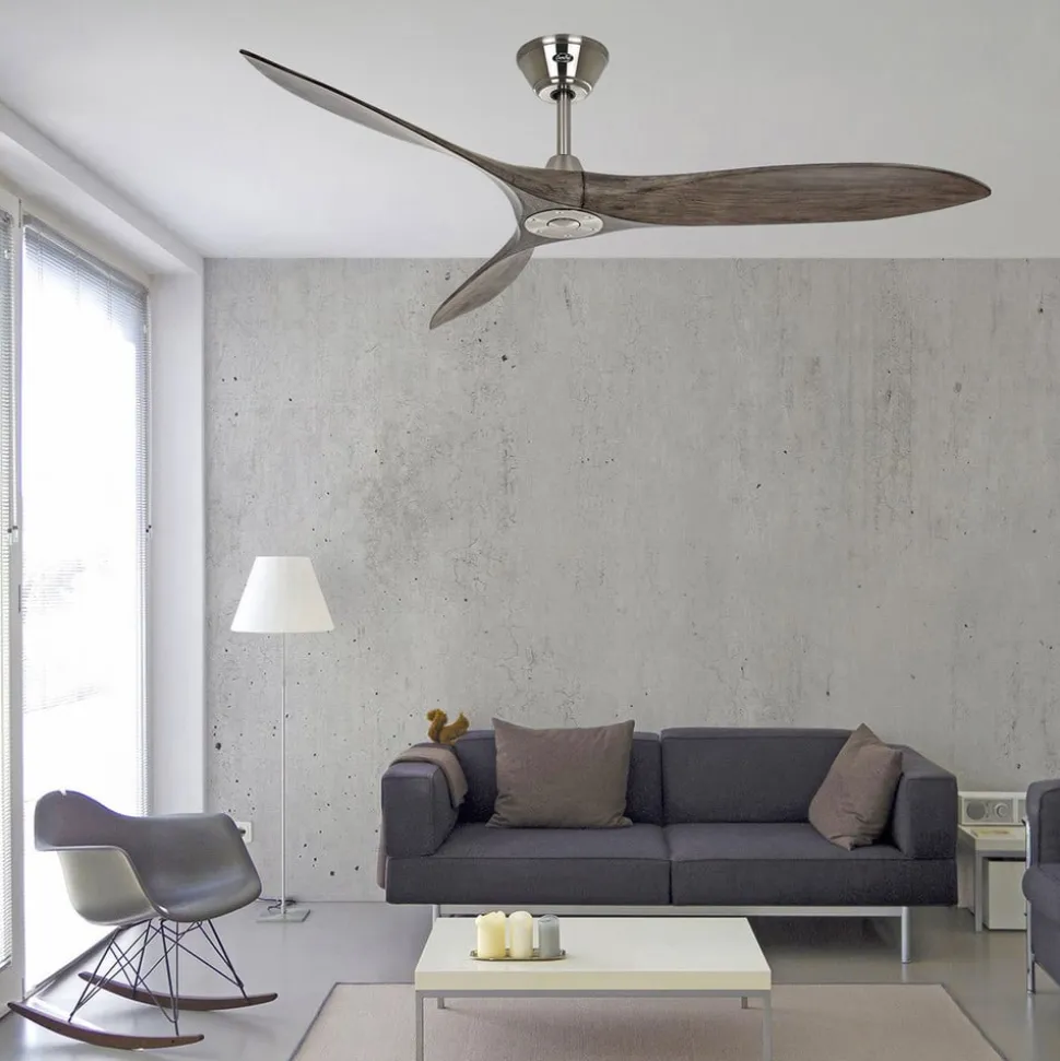 Træloftventilator Eco Airscrew med propellook Fans af historisk flyvning vil blive begejstrede ved synet af Eco Airscrew-loftventilatoren. Bladene er lavet af ældet træ, og deres karakteristiske form minder om gamle propelflyvemaskiner. Loftventilatoren, som er særligt velegnet til store rum og altid kører stille, er funktionelt i tråd med tiden. Funktioner Seks hastighedsniveauer giver dig mulighed for at vælge den rigtige hastighed til situationen. Tanken om energieffektivitet er realiseret med den patenterede DC-motor og reverse-funktionen. Sidstnævnte omfordeler den varme luft om vinteren for at reducere varmeomkostningerne. Alle indstillinger kan styres med den medfølgende fjernbetjening, som der medfølger et vægbeslag til. Tekniske data – Kan også installeres på skråninger op til 16° – Motor med energibesparende, patenteret DC-teknologi – Vægt: 7 kg Effekt pr. hastighed: – 3,2 W ved 49 o/min – 3,6 W ved 58 o/min – 4,9 W ved 78 o/min – 6,8 W ved 94 o/min – 10,4 W ved 121 o/min – 16,1 W ved 149 o/min