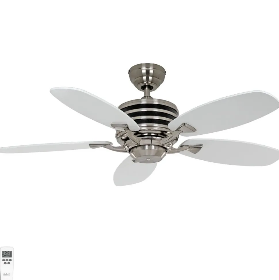Eco Gamma loftsventilator med fem blade og kromelementer Eco Gamma er en loftsventilator til moderne interiør, som har et visuelt tiltalende look takket være kromfinishen på beslaget og motorenheden. De vendbare trævinger giver mulighed for at tilpasse designet. Funktioner Loftventilatoren imponerer med en række nyttige indstillingsmuligheder. De seks hastighedsniveauer, slowmotion-niveauet og rotationsretningen kan styres via fjernbetjeningen. Om vinteren kan Eco Gamma hjælpe med at reducere varmeomkostningerne ved at omfordele den varme luft, der er fanget under loftet, i hele rummet. Den særligt støjsvage drift af den energieffektive, patenterede DC-motor og de afbalancerede roterende elementer gør loftventilatoren til en særlig behagelig del af indretningen.