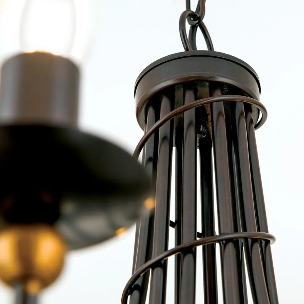 Vellykket smedearbejde med antiklakeret jern giver et herregårdsagtigt snit og en stemningsfuld belysning. De gyldne pyntekugler, som kendetegner hele serien, giver lysekronen en speciel karakter.