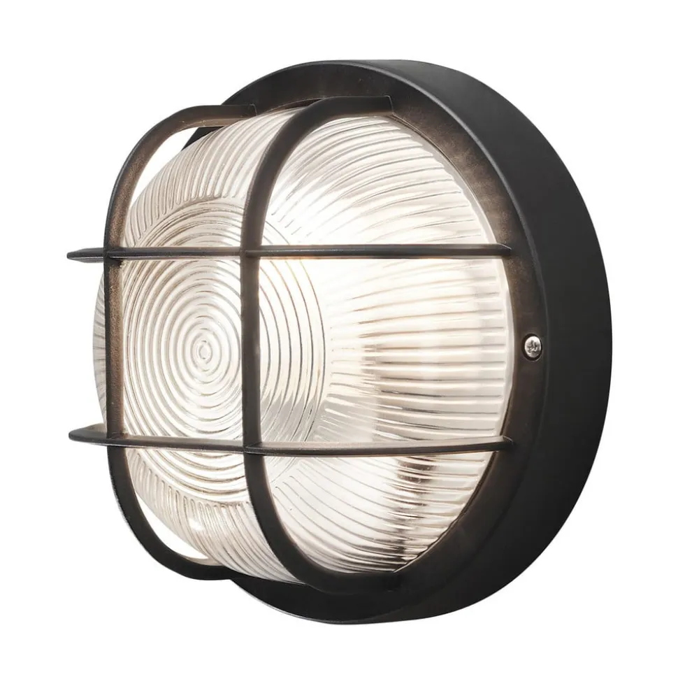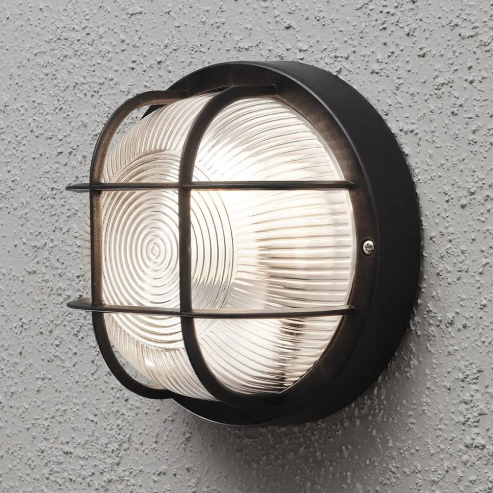 Lidt teknisk udseende Elmas udendørs væglampe – rund form Beskyttelsesgitteret over glasset giver Elmas udendørs væglampe et lidt teknisk flair. Glassets riller er særligt iøjnefaldende: De er designet i to forskellige mønstre, som er særligt effektive, når lyset er tændt, og skaber en særlig lysstemning. Elmas-væglampens krop er lavet af robust plast.