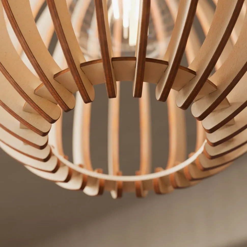 Skærmene er kugleformede og består af enkelte træelementer. Disse er forskudt i forhold til hinanden og skaber dermed et tiltalende åbent udseende. Desuden er der fri udsigt til pærerne, så det er muligt at bruge dekorative lyskilder. Lyset spredes ned mod gulvet og samtidig ud til siderne, hvilket skaber smukke lyseffekter i rummet.