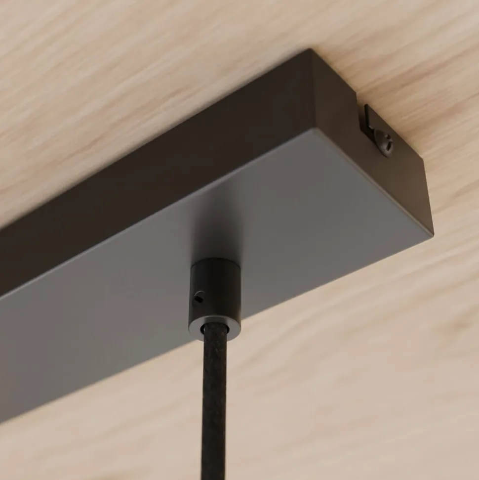 3 lyskilder hængelampe Clay med kugleformede træskærme og rektangulær baldakin Med dette design giver lampen et moderne og samtidig naturligt præg i stuen. Clay er perfekt til belysning af stue- eller spiseborde.