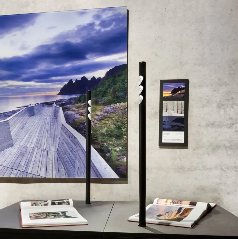 Minimalistisk Lucy LED-skrivebordsarmatur fra ERCO – kan skrues fast i bordpladen En pulverlakeret rørformet aluminiumsprofil udgør kroppen på Lucy LED-skrivebordsarmaturet. LED’erne er integreret i den øverste del, og deres lys udsendes skråt nedad gennem tre åbninger, der er rettet mod den ene side og oplyser bordet eller arbejdsfladen. Lyset kan drejes 180° efter behov. En trykknap med lysdæmperfunktion er placeret direkte på lampen. Til montering kræves der en åbning på Ø 3,5 cm i bordpladen, som aluminiumsprofilens nederste ende skrues fast i med den medfølgende låsemøtrik. Strømforsyningen sker via det medfølgende kabel med plug-in-strømforsyningsenhed – med monteringsbøsning af pulverlakeret messing til bordpladetykkelser fra 1 til 4 cm – reflektor: plast, aluminiumsbelagt, blank sølv – udstyret med blød linse – afblændingselement: plast, sort – tilsluttet belastning: 13 W