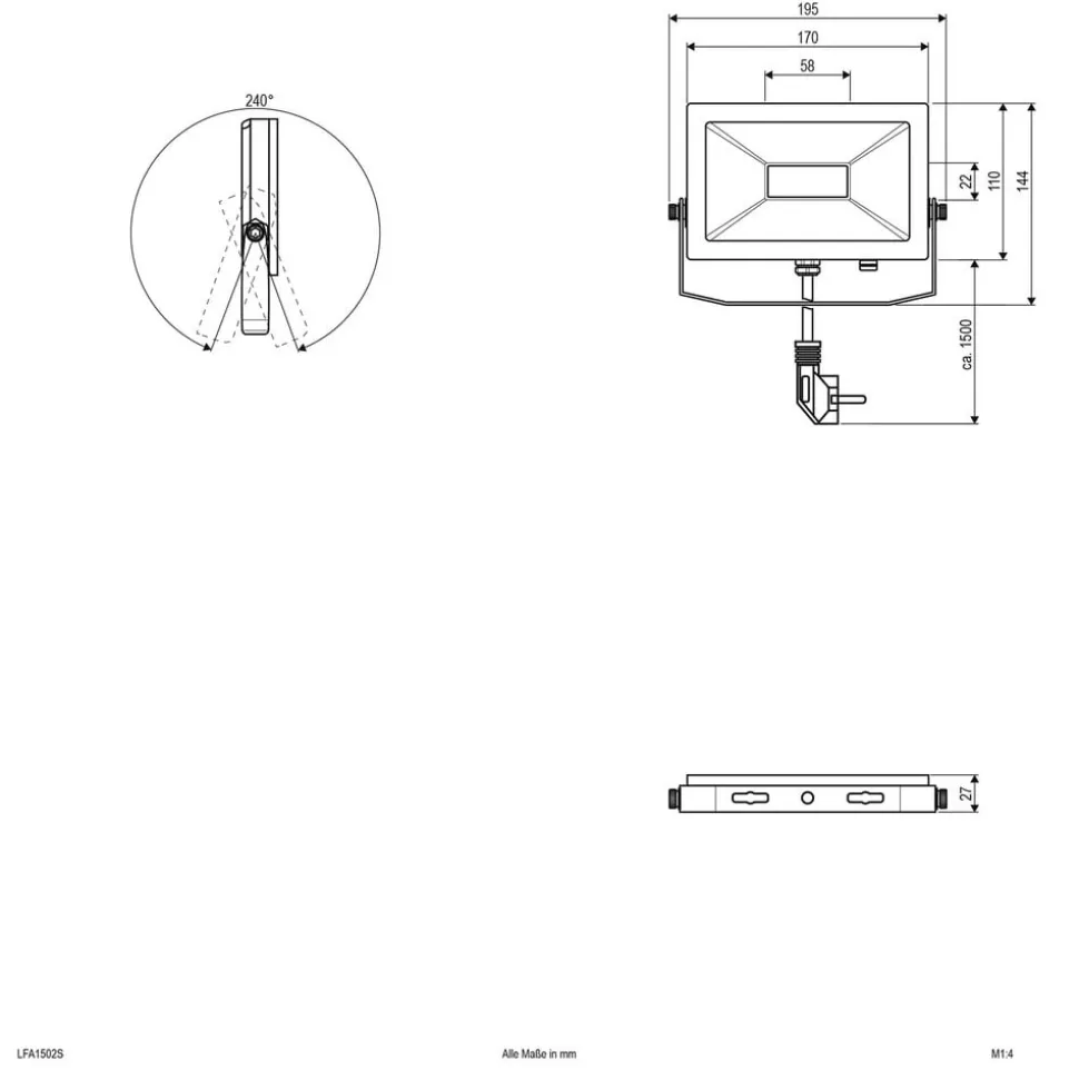Udendørs LED-spot LFA, bred strålevinkel, drejelig, med stikledning Udendørs LED-spot LFA er perfekt til belysning af store områder. Konstruktionen af pulverlakeret aluminium og klart glas er designet til at være modstandsdygtig (IP65, IK07), så den kan bruges i fugtige miljøer og udendørs. LFA kan monteres på væggen, i loftet, på sokler og på gulvet – Tilslutningskabel 1,5 m med jordforbindelse til 230 V-tilslutning – Inklusive betjeningsudstyr – Omgivelsestemperatur under drift: – 20 til + 50 °C – Drejeområde: 240°