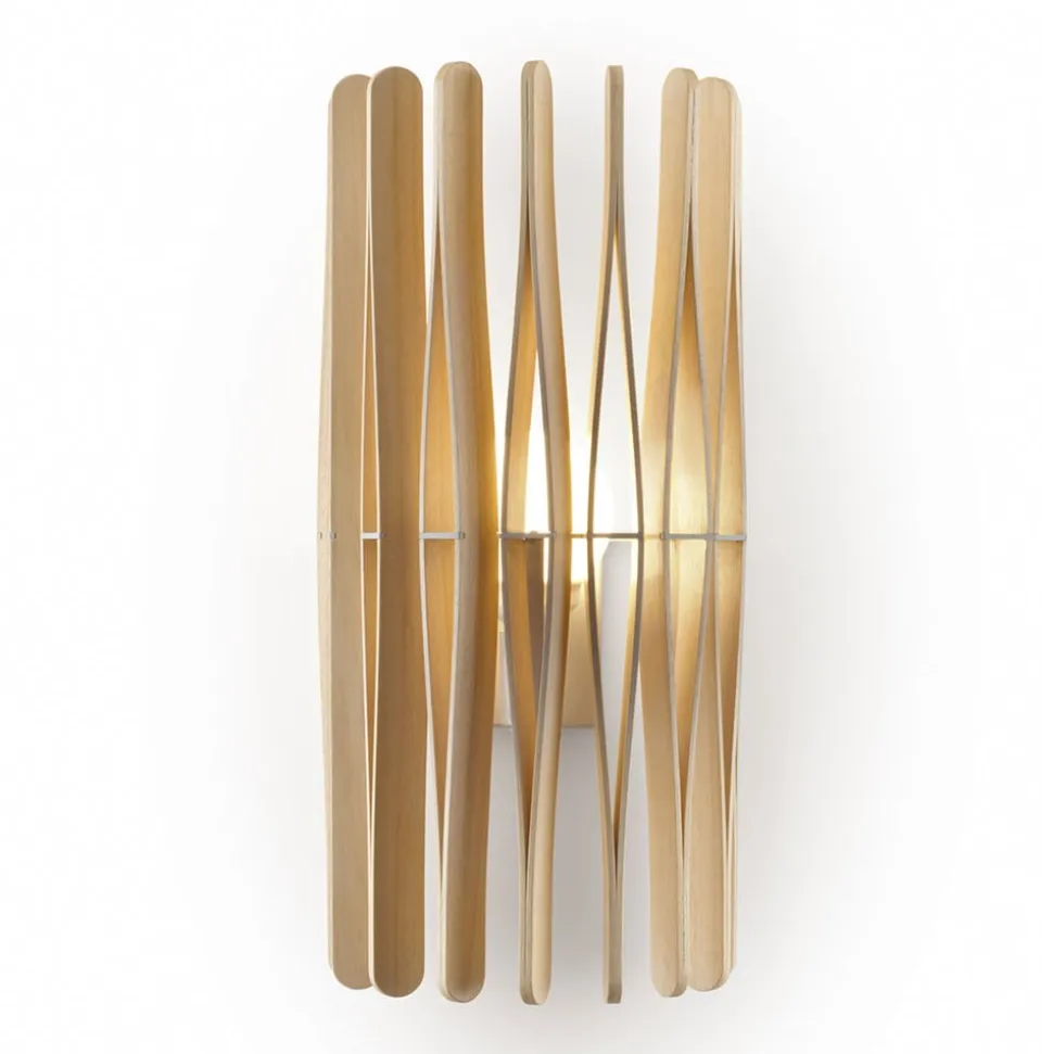 Kompakt væglampe Stick med trælook Kernen i væglampen Stick er flere, i alt mere end et dusin træstivere. To af dem er forbundet med hinanden i begge ender, hvorefter de i midten bygger videre på en mindre åbning. I midten forbinder metalelementer disse individuelle træpar, hvor lyskilden også er placeret i samme højde. På grund af den særlige overfladestruktur i træet, vestafrikansk ayous-træ, bliver lyset nænsomt rettet. Lyset passerer jævnt og let misfarvet gennem træet og ud i rummet. Der skabes en behagelig blød, mindre påtrængende lystone i alle dele af rummet. På grund af højden på 65 cm og fremspringet på 28 cm kan væglampen ideelt integreres som en tilføjelse i venteværelser eller i korridorer. Den er designet af Matali Crasset i forbindelse med den nye kollektion af italienske Fabbian Illuminazione, der producerer i Treviso nær Venedig. Designerstykkerne eksporteres til mange dele af verden, herunder New Zealand, Australien og Tyrkiet.