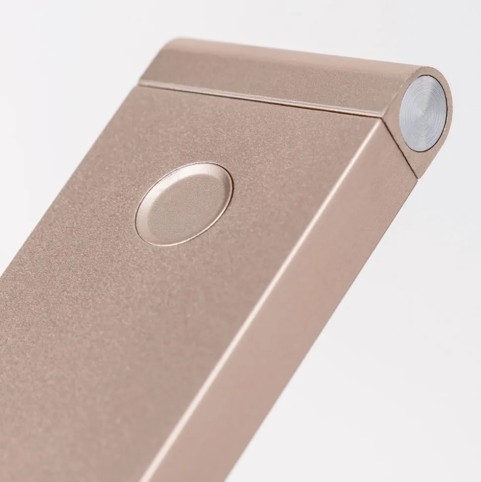 Foldbar LED-bordlampe Falto med genopladeligt batteri og USB-ladekabel – guld Den guldfarvede LED-bordlampe Falto er moderne – både visuelt og funktionelt – og kræver ikke en stikkontakt i nærheden for at fungere. Falto er udstyret med et genopladeligt batteri, der giver ca. tre timers lys, når det er fuldt opladet. En trykknapkontakt er integreret i lampens hoved, som kan bruges til at justere lysstyrken til et af fire niveauer. Når den er foldet sammen, måler Falto bordlampen kun 1 cm i højden, hvilket gør den ideel til at rejse med. Den passer i enhver kuffert og skuffe.
