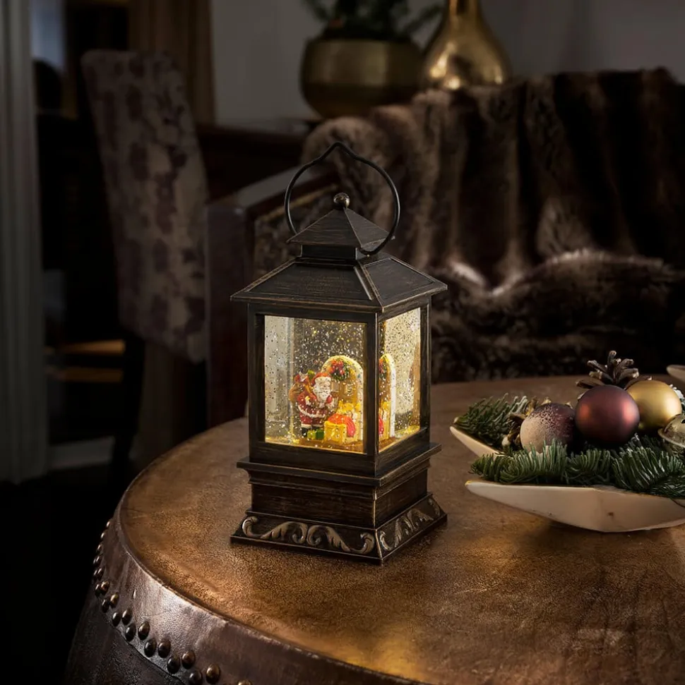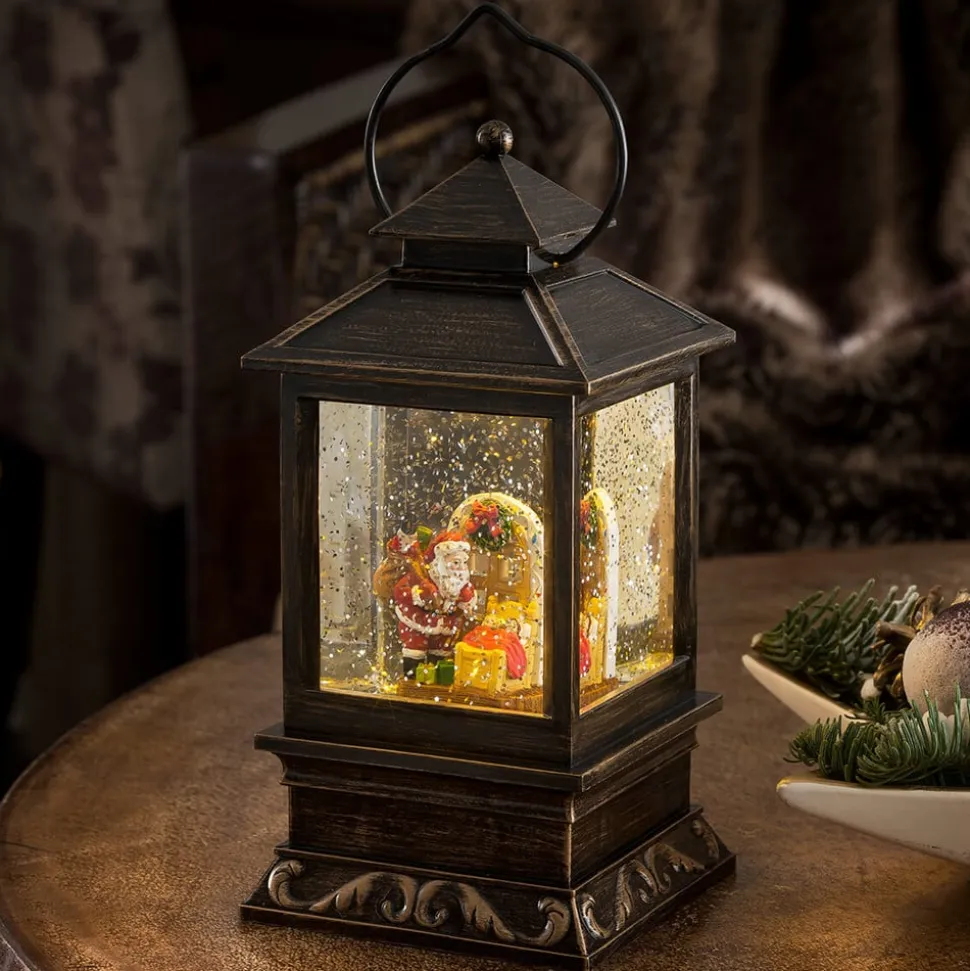 Denne smukke lanterne er fyldt med vand: Indvendig er der – ligesom i de populære snekugler – et vinter-jule-sceneri, hvor man kan se julemanden med sin sæk og to børn, han vil give gaver. Denne dekorationslanterne Julemand og Børn skaber med sit gammeldags design en nostalgisk stemning overalt, hvor den stilles hen. Man behøver ingen strømtilslutning, da lanternen fungerer med tre AA-batterier. Batterierne er ikke omfattet af leveringen, men kan bestilles under tilbehør.