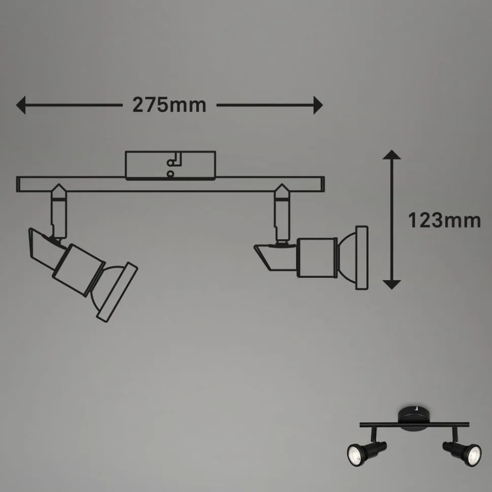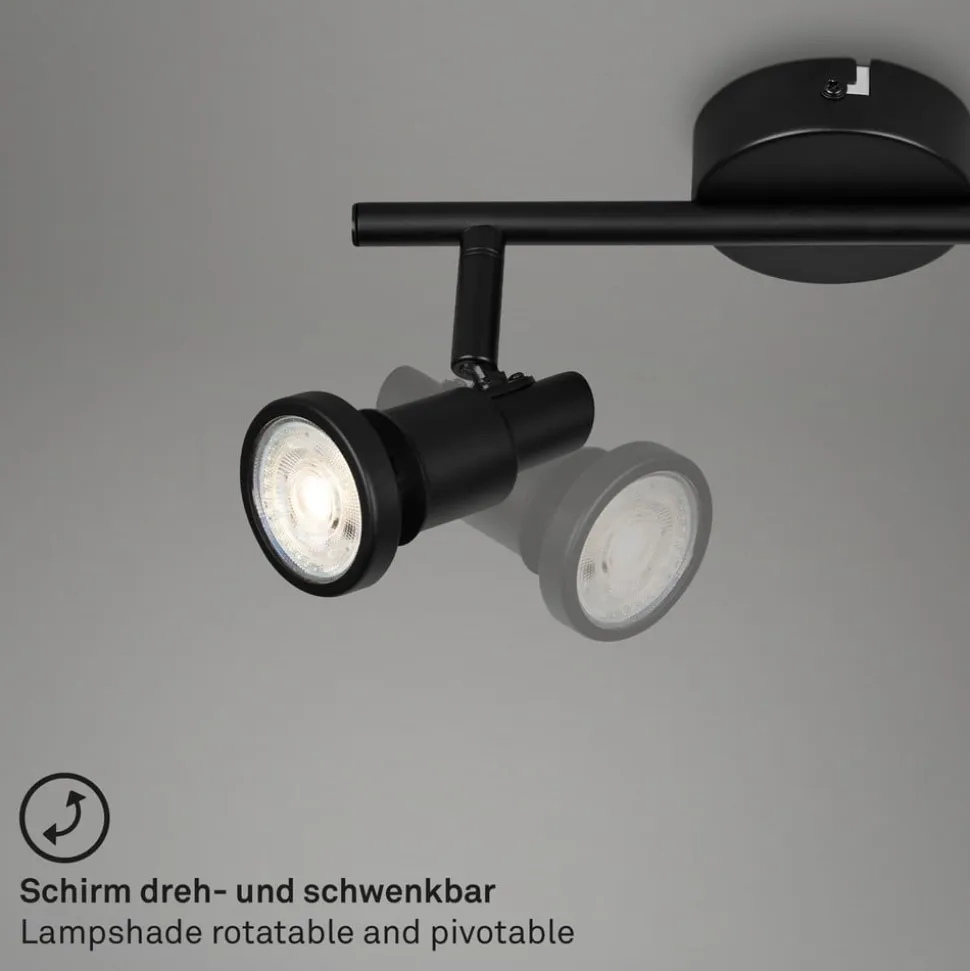 To-lys LED-loftspot Flamo i sort, velegnet til badeværelsetLoftspottet Flamo er særligt alsidigt takket være stænkvandsbeskyttelsen (IP44), de justerbare hoveder og de udskiftelige pærer. LED-loftspotten er lavet af metal, i neutral sort og leveres med to varmhvide GU10 LED-pærer.
