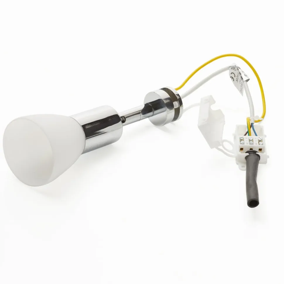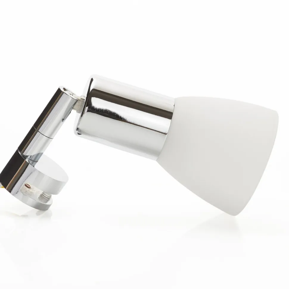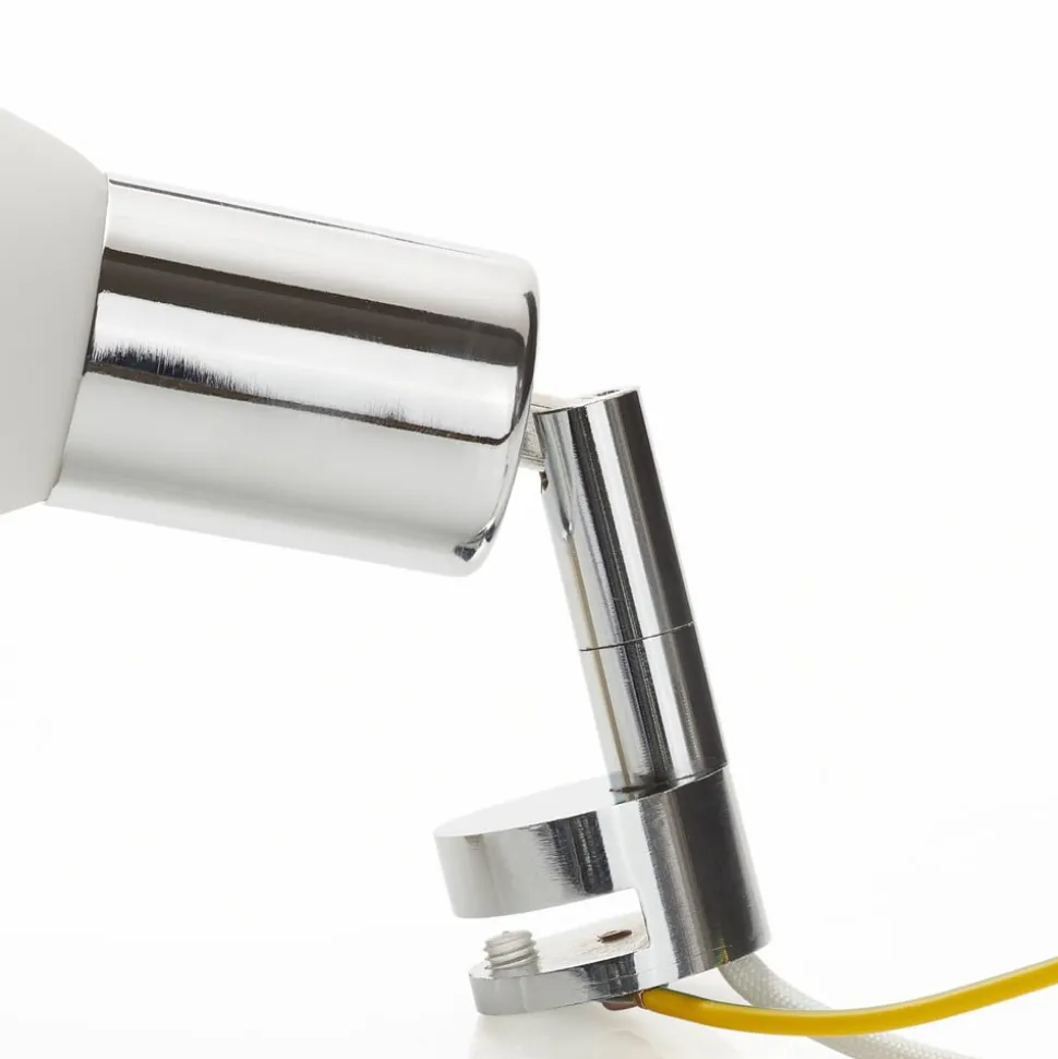 Flytbar spejllampe JENNY med drejeligt spotlight Den elegante spejllampe JENNY monteres ganske enkelt på spejlet (klemmeområde op til 5 mm) og bader badeværelset i et varmt, blændfrit lys. Basen i forkromet metal kan drejes og justeres efter behov. Spotlightet er omgivet af en skærm af satineret glas, som giver en særlig blød belysning. Armaturerne fra denne producent er omhyggeligt håndlavede. Det garanterer holdbare produkter af høj kvalitet, som lever op til de højeste kvalitets- og sikkerhedsstandarder.