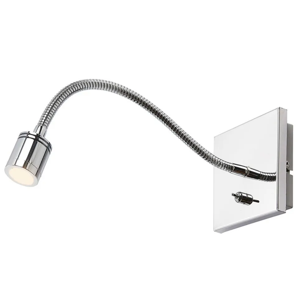LED læselampe Berfin i skinnende krom med bøjelig svanehals og kontakt