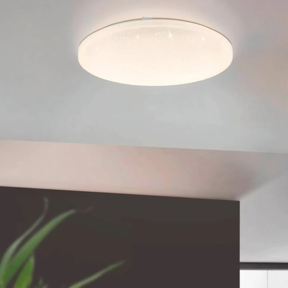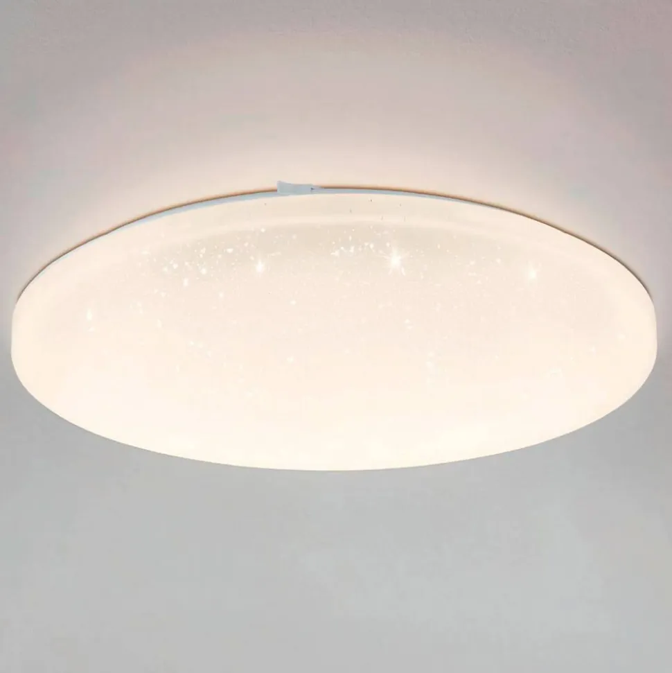 Frania-S LED-loftlampe er en lyskilde til generel belysning, der kan bruges næsten universelt i alle rum og omgivelser.Loftselementet i lyset er lavet af stål, lampeskærmen er lavet af plast. Skærmen har en krystaleffekt, der næppe kan ses, når den er slukket. Så snart lampen er tændt, vises der dog en blinkende stjernehimmel på skærmen, hvorpå mindre og større stjerner glitrer som krystaller.