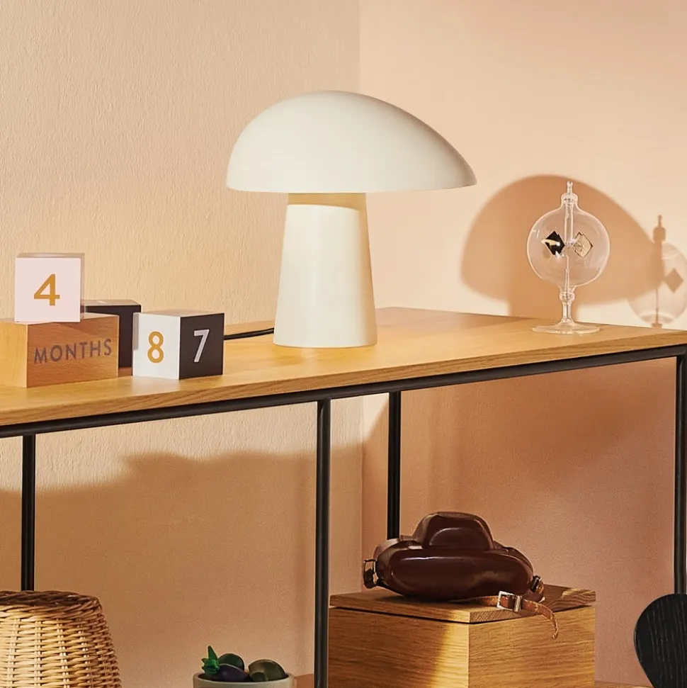 Denne bordlampe, f.eks. på en skænk, ligner allerede slukket en dekorativ detalje i en sofistikeret boligstil. Men så snart den er tændt, fremhæver det bløde, indirekte lys ikke kun omgivelserne, men sætter også den let konisk formede sokkel i scene. Skærmen er lavet af lakeret aluminium og kan drejes, så du altid kan ændre udseendet.