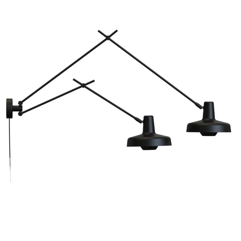 Tidløs Arigato-væglampe med to justerbare skærme Designet af Arigato-væglampen, der er designet og fremstillet af det kroatiske firma GRUPA, kan kombineres på en absolut alsidig måde. De to slanke stålarme er hver opdelt i to sektioner, der hver holder en rund aluminiumsskærm. Der er plads til en lampe bag hver skærm, så direkte lys afskærmes, og der opnås optimal visuel komfort. Den hvidlakerede inderside sikrer også en effektiv lysfordeling. Arigato-væglampen gør ikke kun en god figur i stuen, men imponerer også i arbejdsværelset takket være sin fleksibilitet. Armaturets sektioner er forbundet med samlinger, så f.eks. den ene skærm kan orienteres mod væggen til indirekte belysning og den anden til bordbelysning – Udstyret med stik og afbryder – Også velegnet til fast tilslutning – Made in Europe