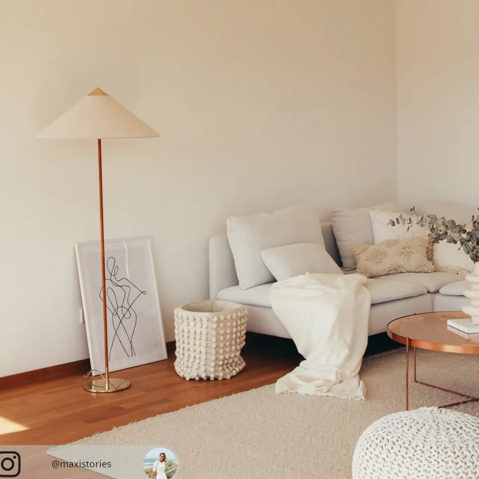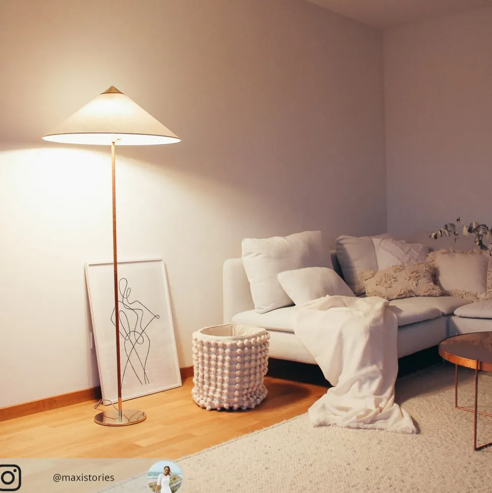 standerlampe 9602 imponerer med sin tidløst elegante skønhed og kan bruges i kombination med adskillige møbler som en effektiv ekstra lyskilde. Den består af en metalbase med messingfinish, hvorfra en stang dækket af rotting strækker sig opad. Denne bærer en skygge, hvis form har givet lampen kaldenavnet “kinesisk hat”.