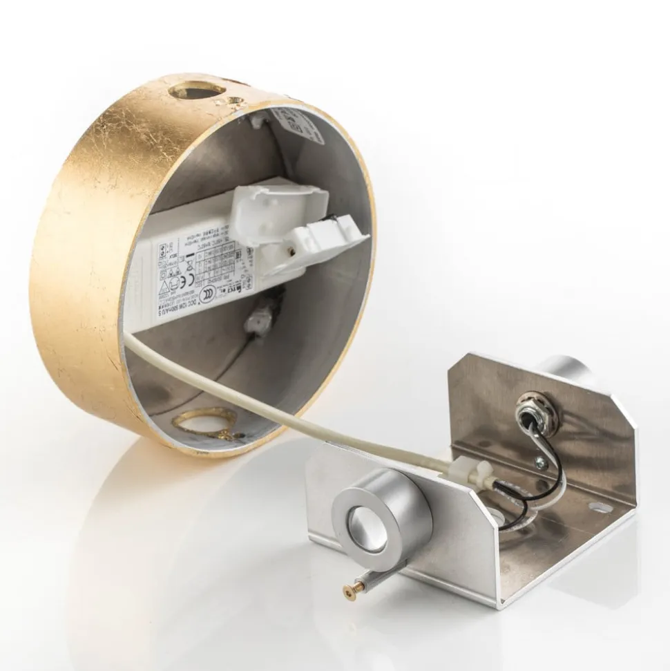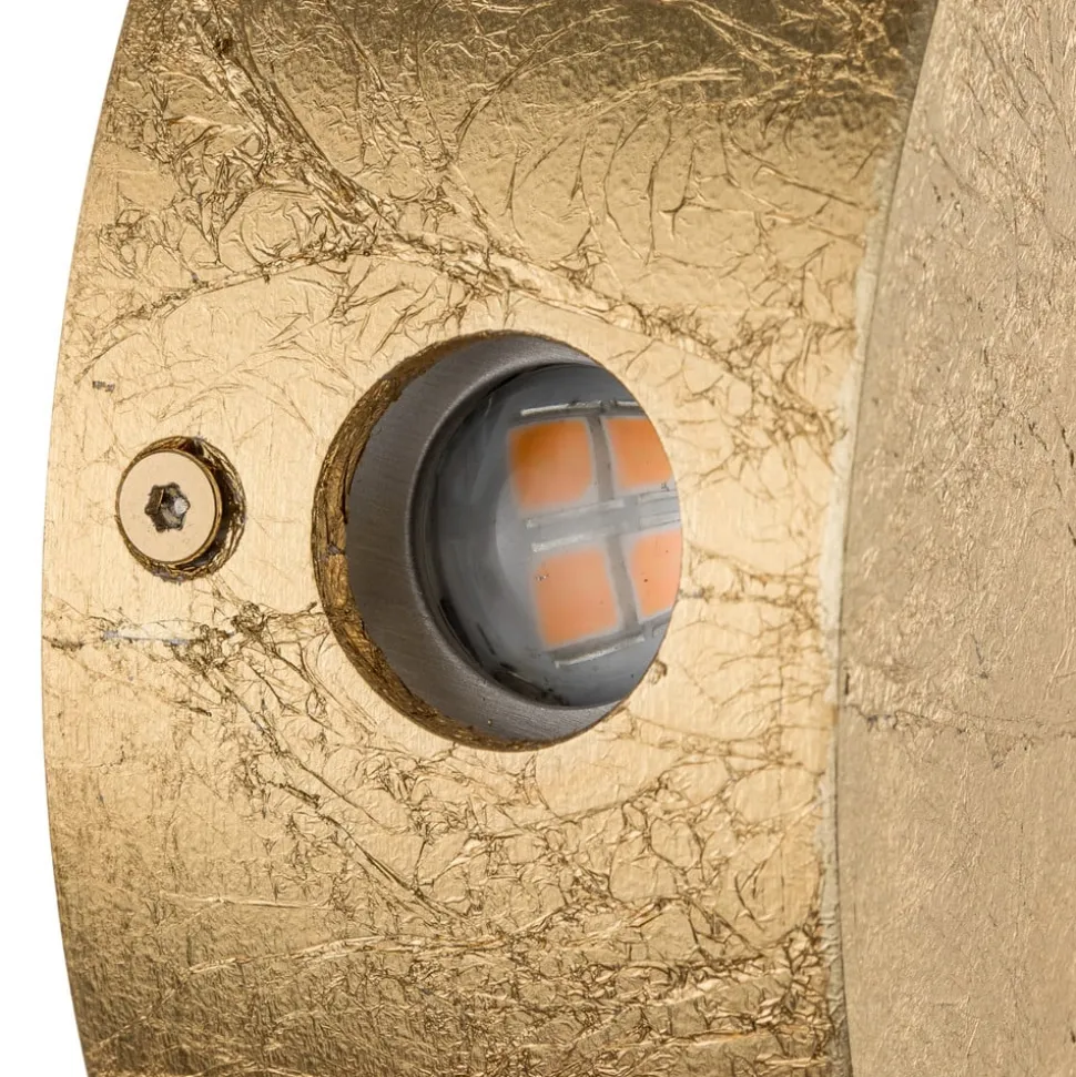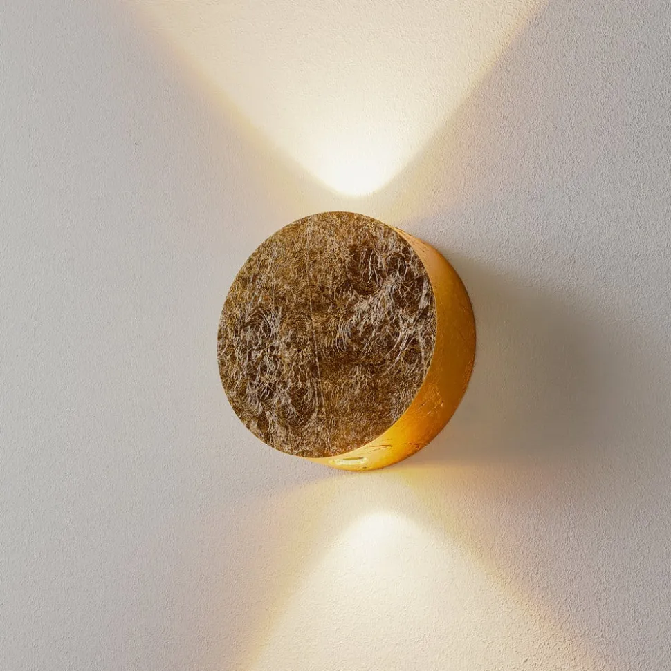Opad- og nedadlysende LED-væglampe Sunny – forgyldt bladNår den er slukket, ligner LED-væglampen Sunny af forgyldt aluminium blot et smukt dekorativt element på væggen. Når den er tændt, udsender den atmosfærisk ekstra lys både indirekte opad og direkte nedad, som den ædle guldbelægning giver en ekstra varm glans. Sunny-væglampen passer til mange forskellige indretningsstile og er lige så smuk på væggen i stuen som en indbydende lyskilde i entreen.