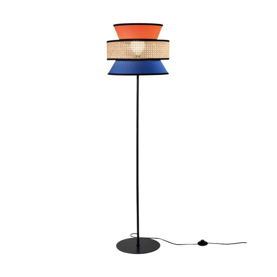 Gazebo gulvlampen forener materialer som stof, rattan og metal til et stilfuldt designobjekt. Kombinationen af naturlige og livlige farver – orange, blå, natur og sort – skaber et harmonisk helhedsindtryk, der passer perfekt ind i forskellige boligområder.