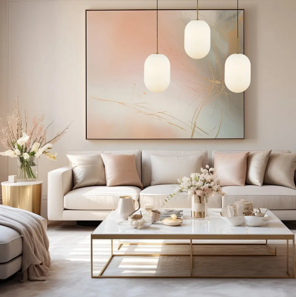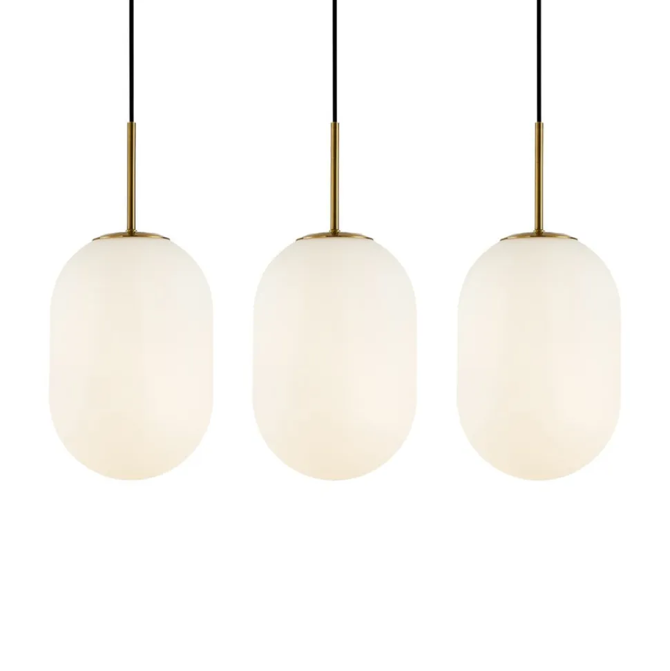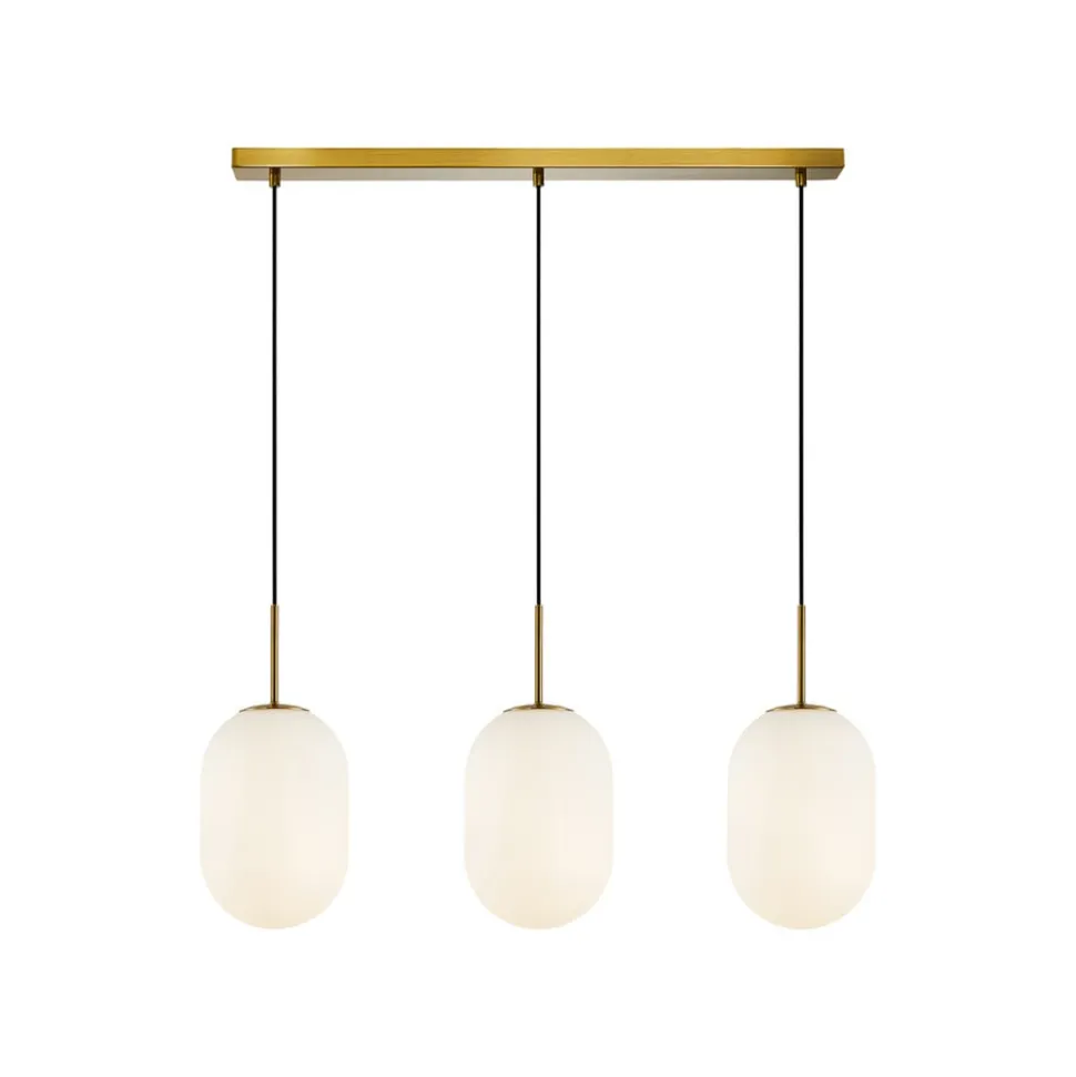 Hængelampen Alias kombinerer moderne design med materialer af høj kvalitet som glas og metal for at skabe et imponerende belysningselement. Kombinationen af opal hvidt glas og guldfarvet metal giver ethvert rum et elegant touch. Med sine 3 lyskilder og aflange form er den ideel til brug i stuer, spisestuer, soveværelser og køkkener.