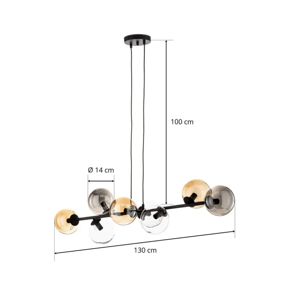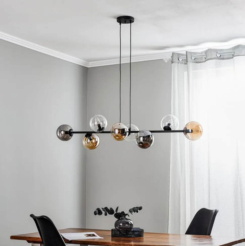Hængelampen Glassy med 8 lyskilder forener moderne design med materialer af høj kvalitet. Den er fremstillet af pulverlakeret stål og glas og fås i farverne sort, grafit, rav og klar. Denne lampe er ikke kun et optisk højdepunkt, men også funktionelt alsidig. Muligheden for dæmpning via en ekstern dæmper gør det muligt at tilpasse lysstemningen individuelt for at skabe forskellige atmosfærer.