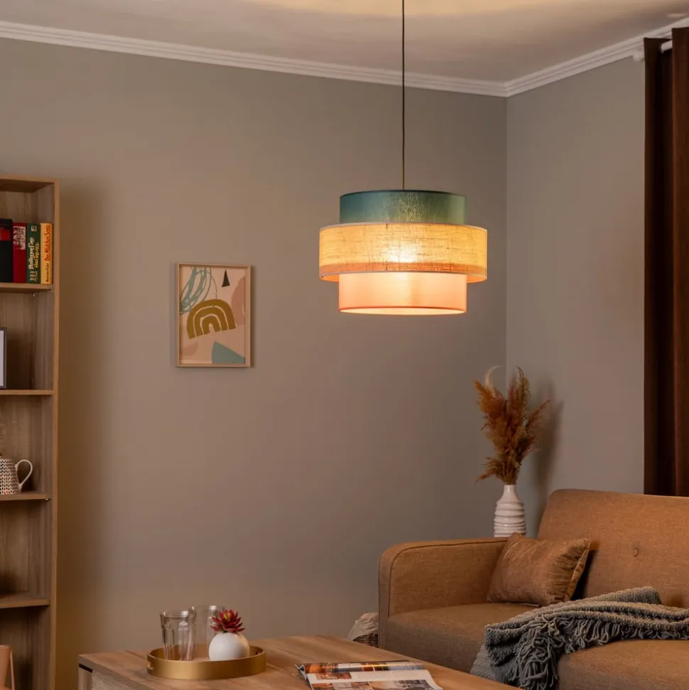 Hyggelig Trio-pendel med tre-lags jute-tekstilskærm Trio-pendlen har en flot stofskærm bestående af tre cylindriske kugler i petrol, naturbrun og orange. Ophænget med den runde baldakin er i sort.